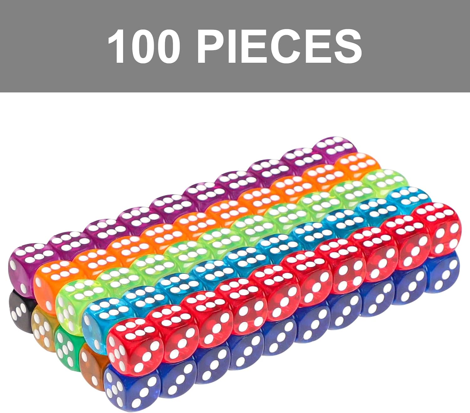 Quantity & Colors: Each dice set includes 100 dice in 10 translucent colors (10 of each color), offering a variety to meet your needs. The numbers are clear and easy to read, and each dice offers excellent texture and reliability.