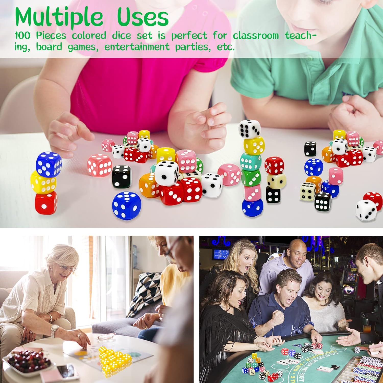 The 100 pieces 6-sided colored dice are ideal for adding some fun to a family game night, birthday party or large event.