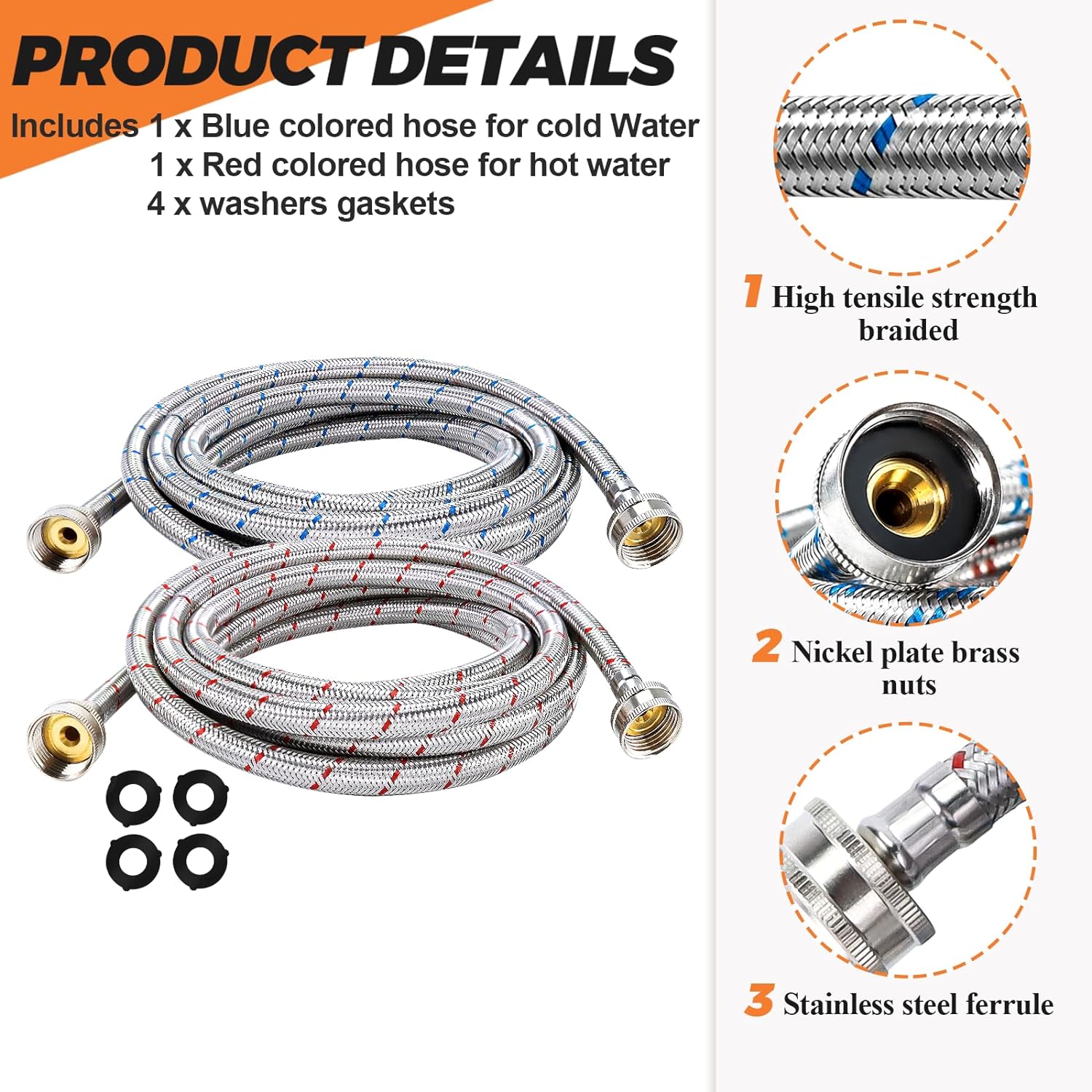 𝟏𝟓𝐟𝐭 𝐖𝐀𝐒𝐇𝐈𝐍𝐆 𝐌𝐀𝐂𝐇𝐈𝐍𝐄 𝐇𝐎𝐒𝐄𝐒—Includes 2 x 15ft stainless steel washing machine hoses,4 x washers gaskets.Red lined for hot water and blue lined for cold water,color coding on the hoses is easy to distinguish them.You can also using washing machine hose for the drain hose on your dehumidifier. Working temperature: -40 to 210F,working pressure: rated to 125psi. It can be used to flush tankless water heaters