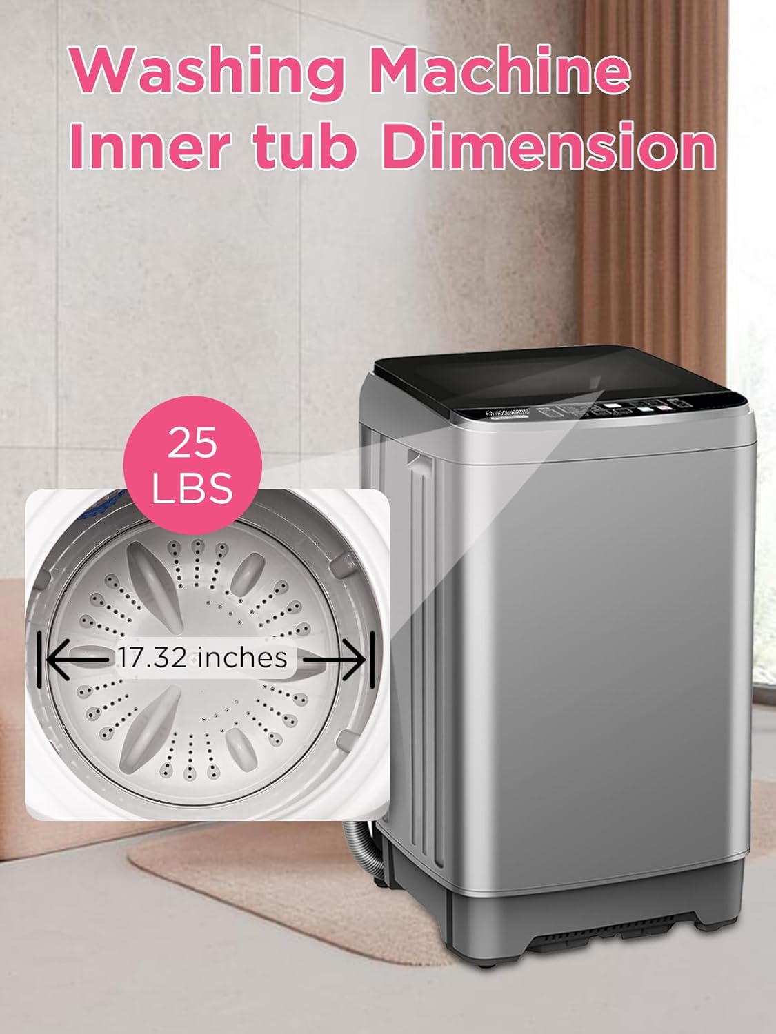 【Large Load Capacity for Family Use】 This fully automatic washing machine is equipped with a powerful motor, and its inner tub could load 25 lbs of clothes at one time, making it perfect for family of 5-6 members. Freeing your hands for efficient cleaning.