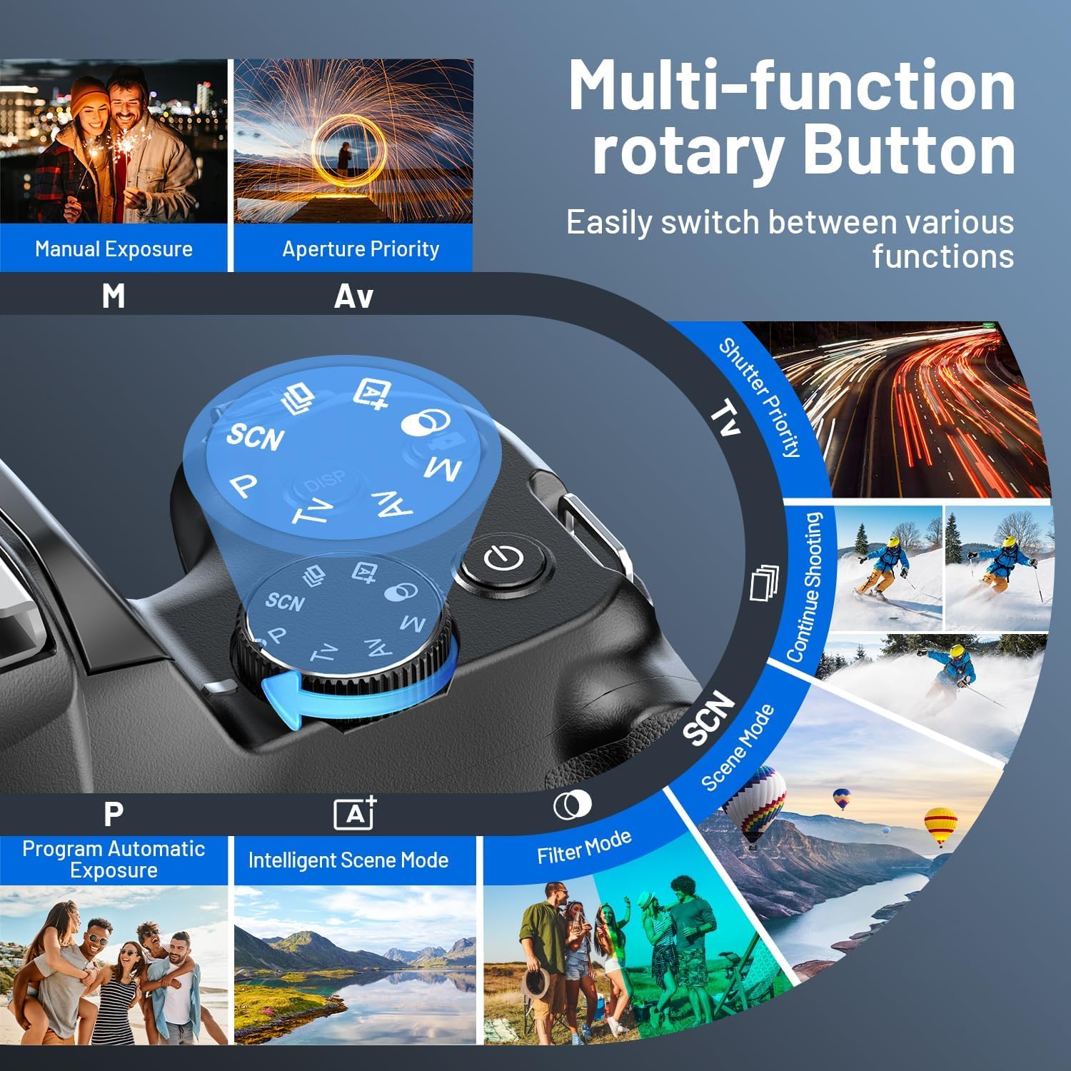 【Rich Filters & Multi-shooting Modes】This point-and-shoot digital camera has 8 unique shooting modes. You can easily change the mode by rotating the button to meet your different photo needs. Built-in 11 filters making your photos more creative and fun. 4K camera also supports time-lapse, continuous shooting, timed shooting and other unexpected features. One camera can satisfy your unlimited creativity.