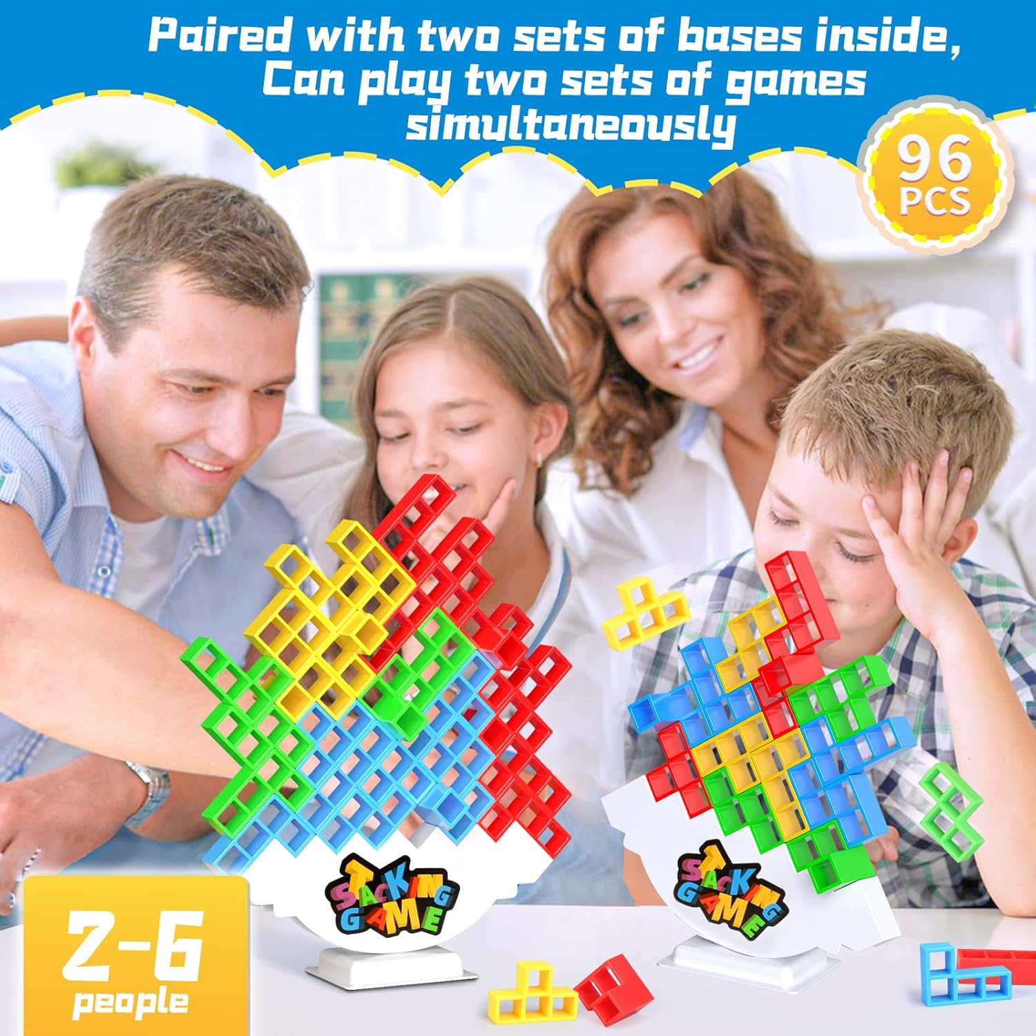 【2-6 players】: Paired with dual accessories. Include 96 stacked blocks, 2 bases, and 44 card extractors. Two sets of games can be played simultaneously. Whether at home, in the office, or in coffee shop, all you need is a table to start playing games.