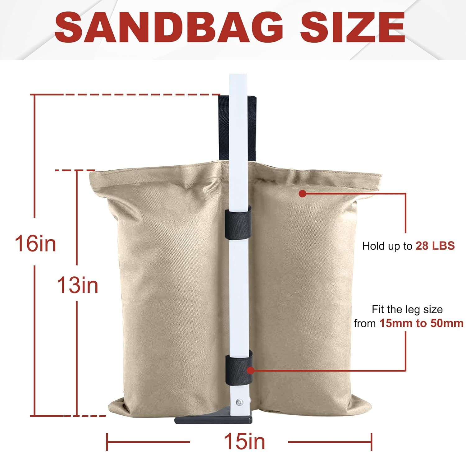 Multiple Versatile Uses: Perfect for securing tents, gazebos, camping shelters, sports umbrellas, and trampolines, these weight bags fit leg sizes ranging from 15mm to 50mm. A must-have for outdoor enthusiasts and event organizers.