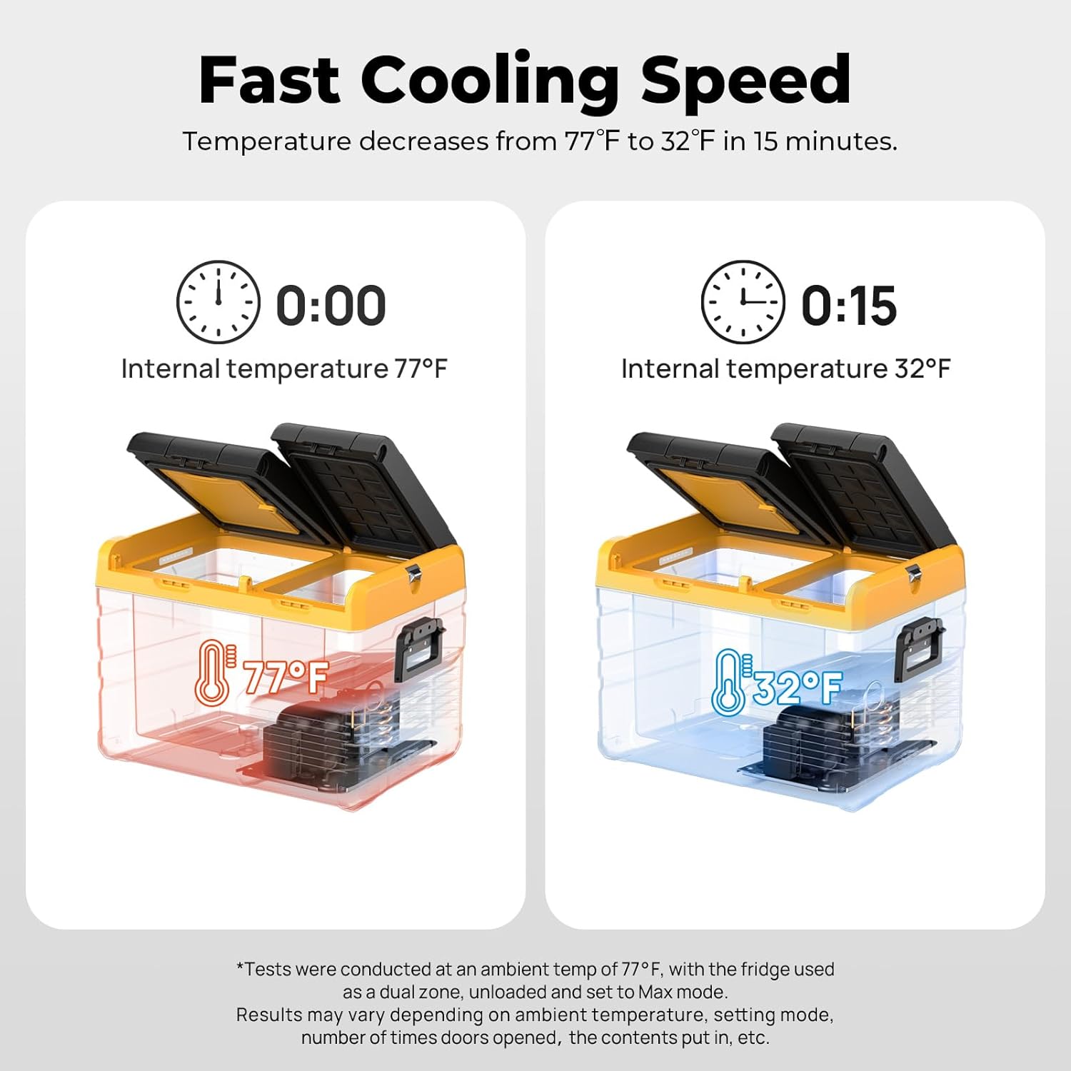 Fast Cooling: The temperature range of both zones is -4℉ to 68℉, each zone can be cooled from 77℉ to 32℉ in 15 minutes, and from 77℉ to -4℉ in 60 minutes, keeping your food fresh, with no ice required, and food will not spoil