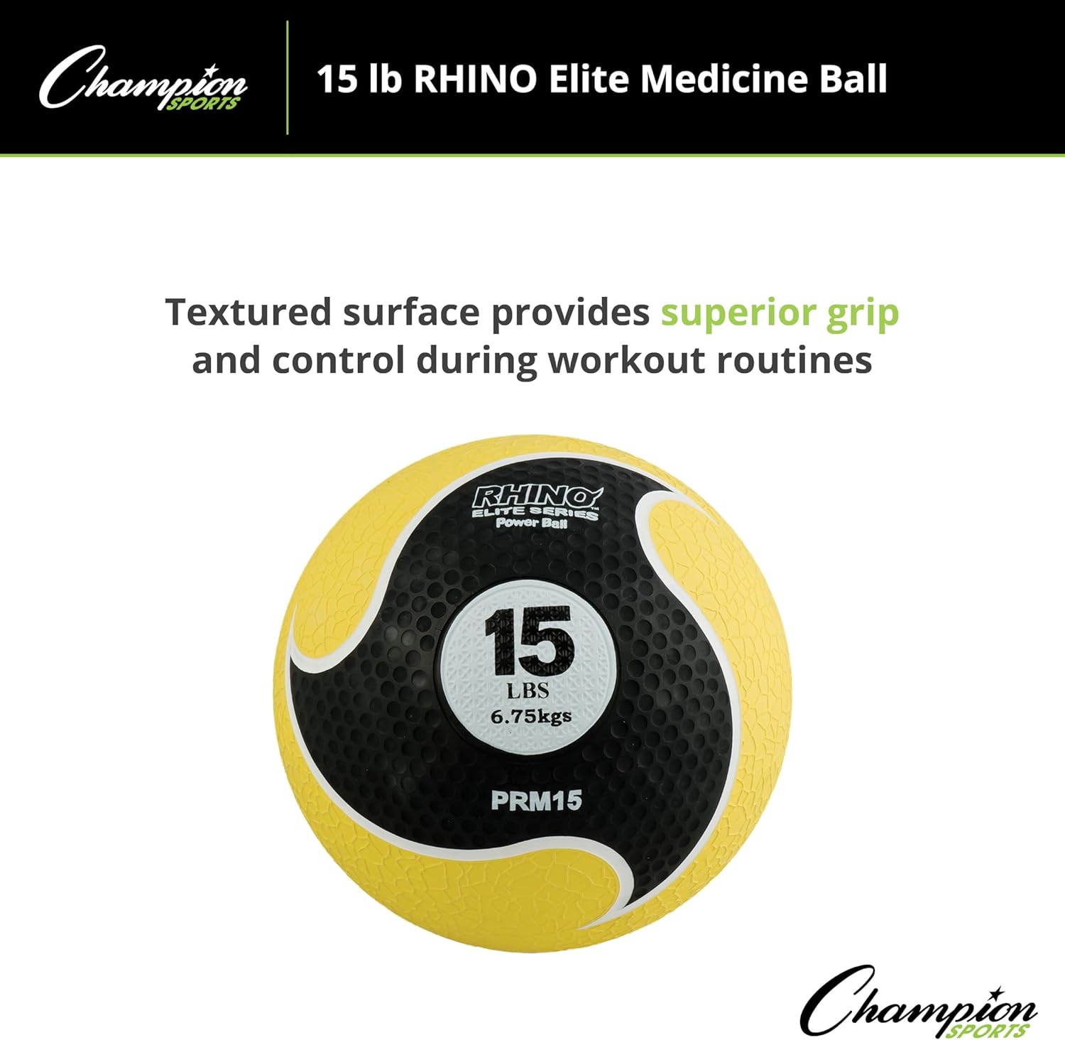 Champion Sports Rhino Elite Medicine Ball-Durable Rubber Weighted Ball & Textured Grip for Core Strength-Cardio & Cross-Training Workouts-Home or Gym Fitness-Yellow (15lbs)