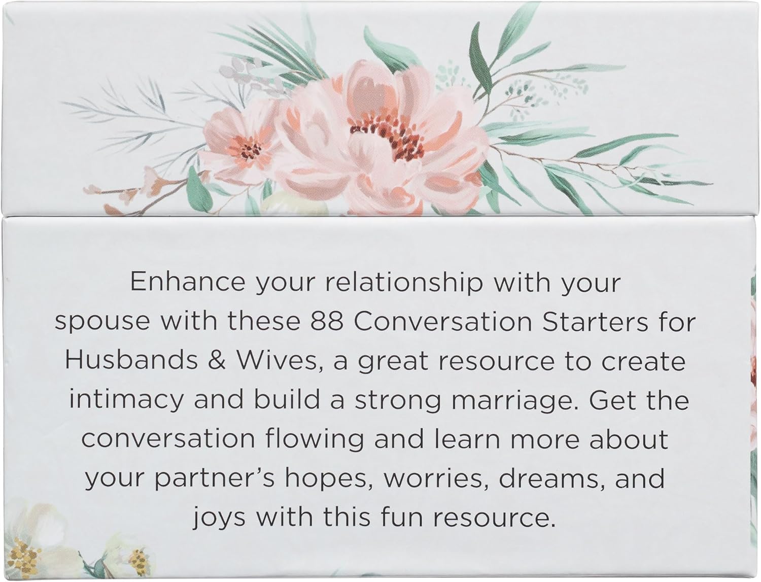 88 WAYS TO GET TO KNOW EACH OTHER: Marriage is a lifelong journey that thrives on great companionship. These 88 Conversation Starters for Husbands and Wives are a fun way for couples to bond and get to know each other better. This conversation starter set contains 44 Premium Double-Sided Cards with thought-provoking questions for married couples. Each side has a question and an accompanying Scripture verse or quote that is sure to spark some lively conversation and lots of laughter.