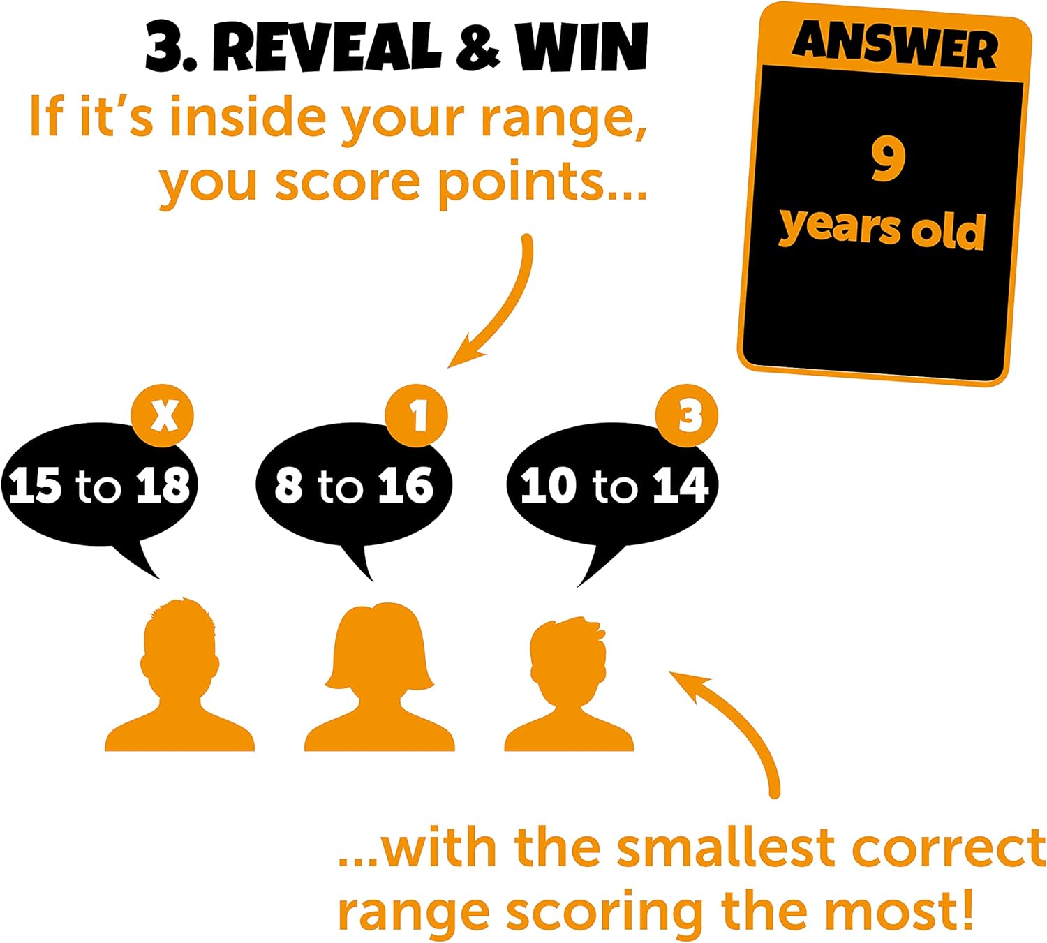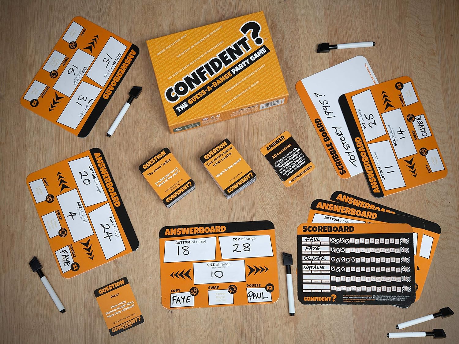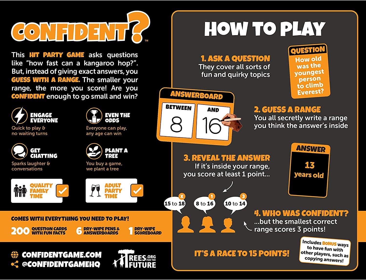 FAMILY & ADULT PARTY GAME: In this hit trivia game you answer entertaining questions with a RANGE. The smaller your range, the more points you score. Everyone stands a chance but are you CONFIDENT enough to win?