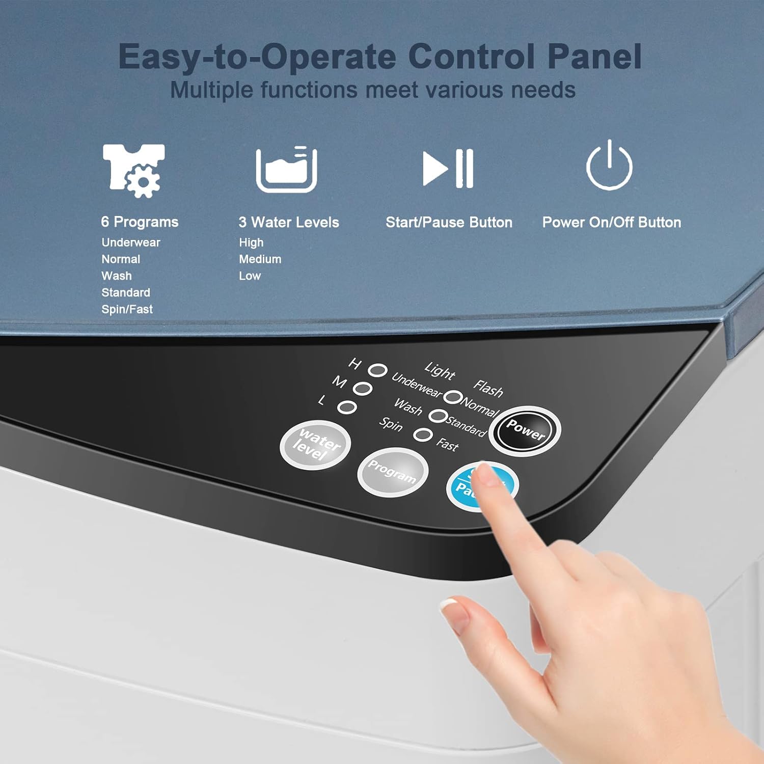 6 programs, 3 water level selections are clearly listed on the control panel