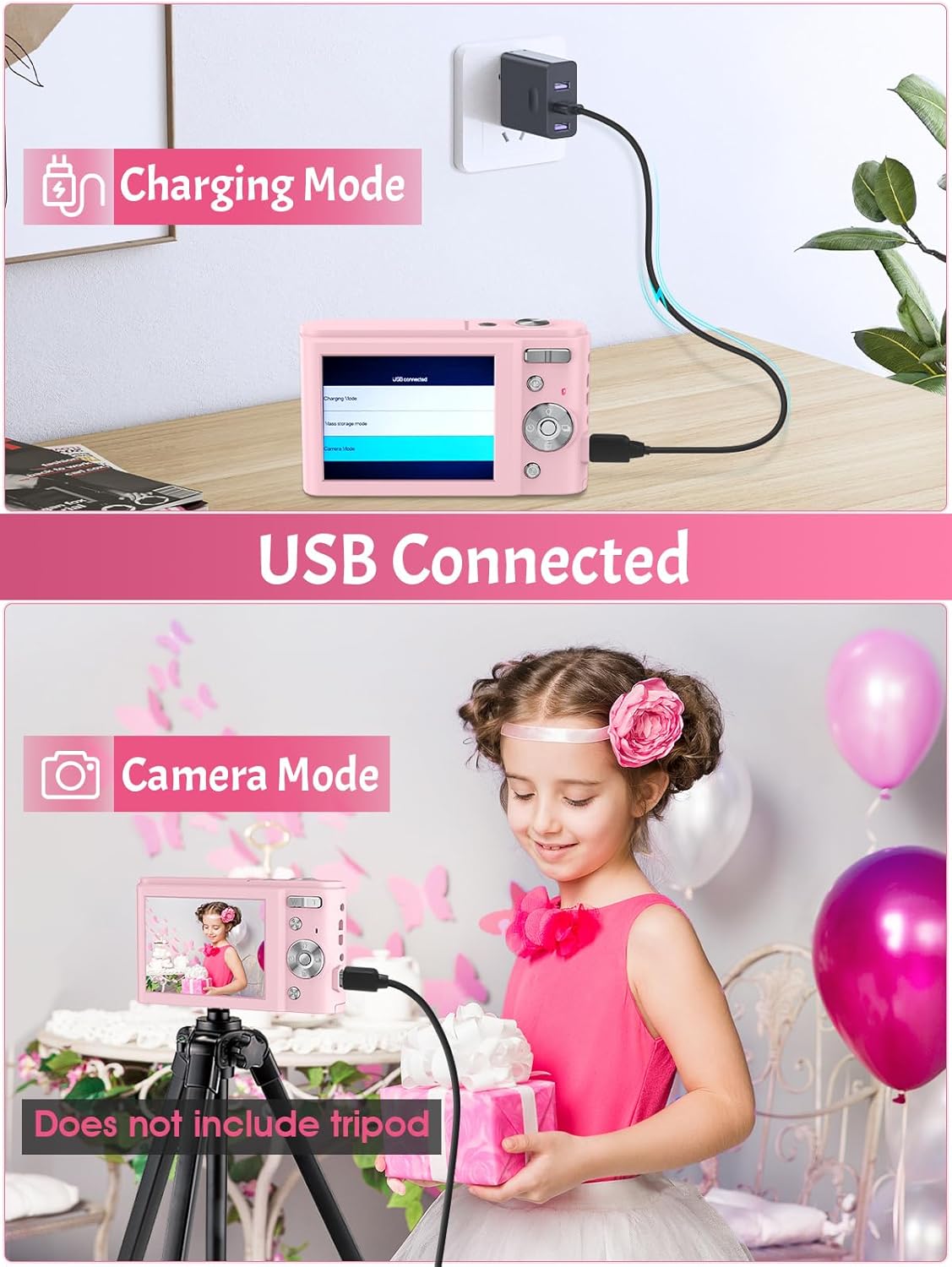 【Multifunctional Camera with Pause Recording】 This compact digital camera doubles as a PC webcam for video calls and live streaming. It features time-lapse to capture the starry sky or blooming flowers and slow-motion playback to relive exciting moments. The pause recording function allows you to continue shooting in the same file. Additional features like anti-shake, burst shooting, timed shooting (3s/5s/10s), loop recording, and flash add more creativity and fun to your everyday photography.