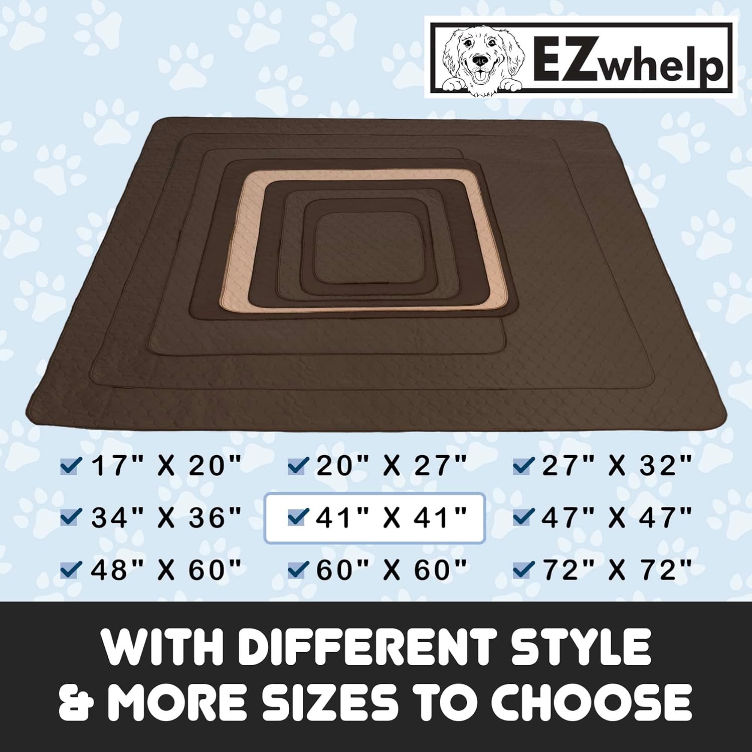 VARIOUS SIZES AND STYLES FOR EVERY PET: We understand that every pet is unique, which is why our EZwhelp Pee Pads come in different sizes and styles. The 41″ x 41″ pads feature a coffee-colored, stain-resistant top and a white bottom. If you need a different size or color, we have you covered! From small to XXL pets, we have the right supplies and accessories to meet your furry friend’s needs. Choose EZwhelp for top-quality pet essentials.