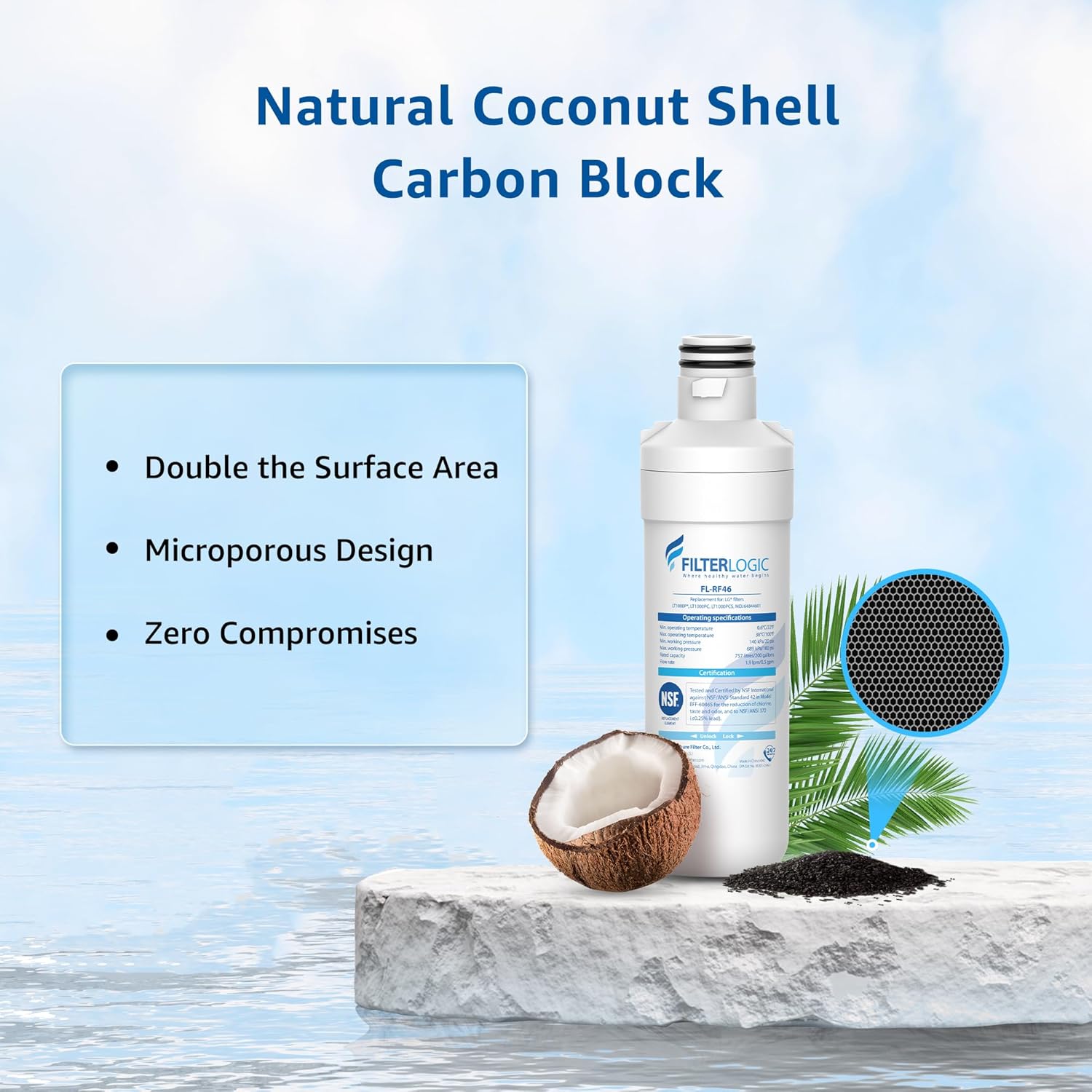 Premium filter material: Here at Filterlogic, we adopt natural coconut shell carbon block containing twice the surface area and more micropores than an inferior carbon block.