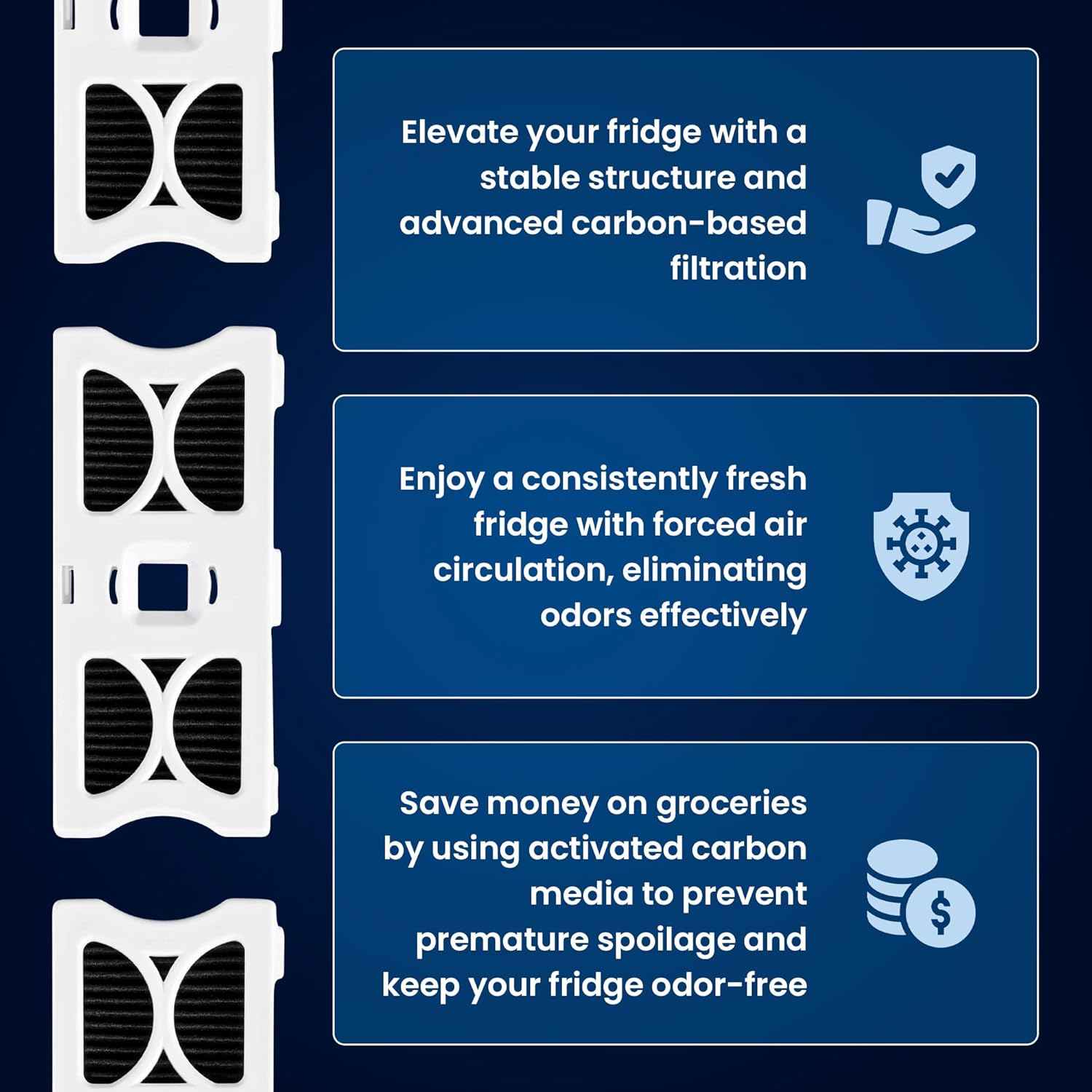 [Advanced Carbon Technology] – Our high-quality, yet affordable, air filter utilizes cutting-edge carbon technology. It acts as a powerful deodorizer, 15 times better than baking soda fridge solutions, to eradicate odors and sustain a clean, fresh environment within your fridge.