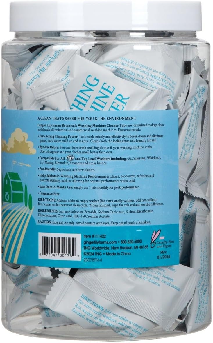 Revive Your Laundry Routine with Ginger Lily Farms Washing Machine Cleaner Tabs! These fragrance-free tablets offer fast-acting cleaning power to eliminate grime, hard water buildup, and residue, ensuring a fresh-smelling machine and clothes. Compatible with all HE and top load washers, these tabs help maintain optimal machine performance with just one monthly use. Say goodbye to odors and hello to revitalized laundry days with Ginger Lily Farms.
