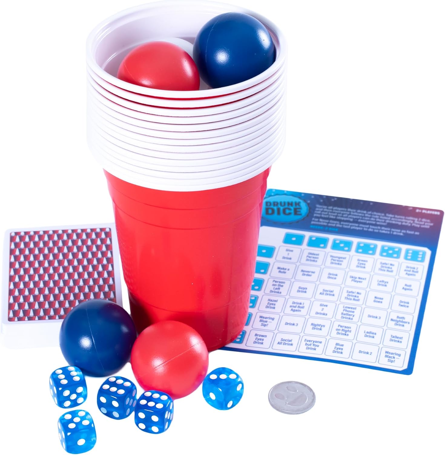 Durable & Spill-Proof Supplies: Includes 14 sturdy cups, 6 plastic balls, 5 dice, 1 coin, 52 spill-proof cards, a double-sided rule card, and complete instructions.