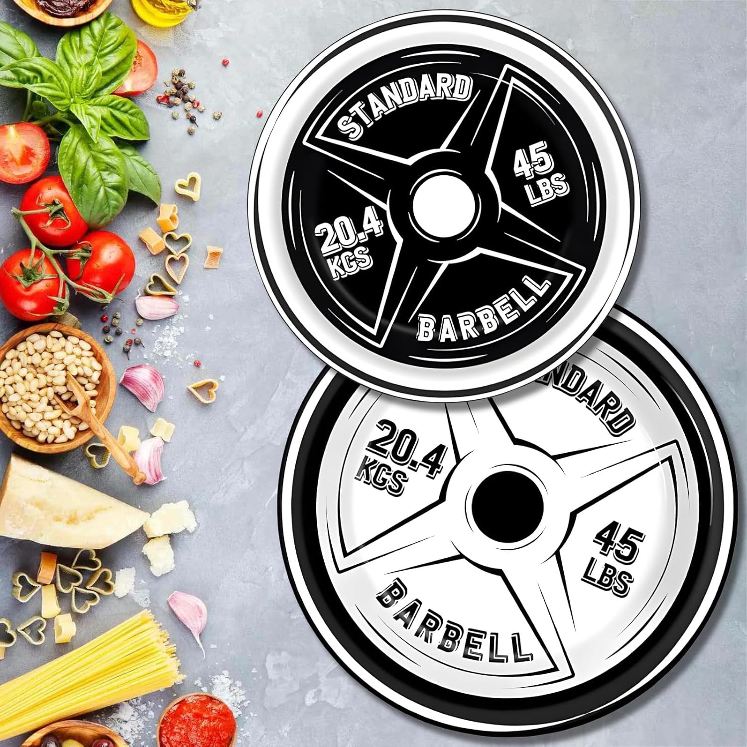 GYM PARTY SUPPLIES:Bodybuilder themed party tableware set features standard barbells in a fitness-inspired pattern to add a sporty touch to your party.