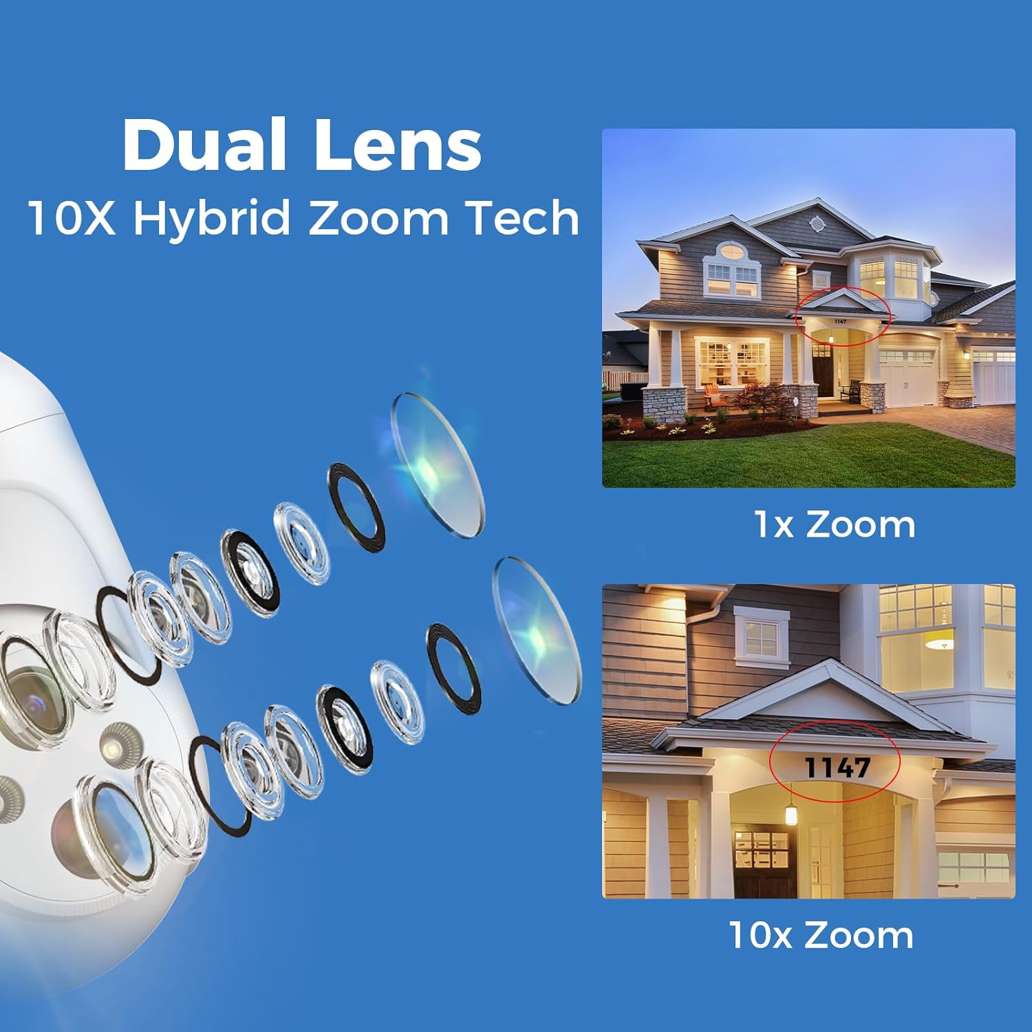 【Enhanced Dual Lens Camera Clarity & 10X Zoom】Capture everything that happens in your home in ultra-sharp resolution. See exactly who is approaching your home with 10x zoom. Short zoom lens for the big picture, long zoom lens for the details.