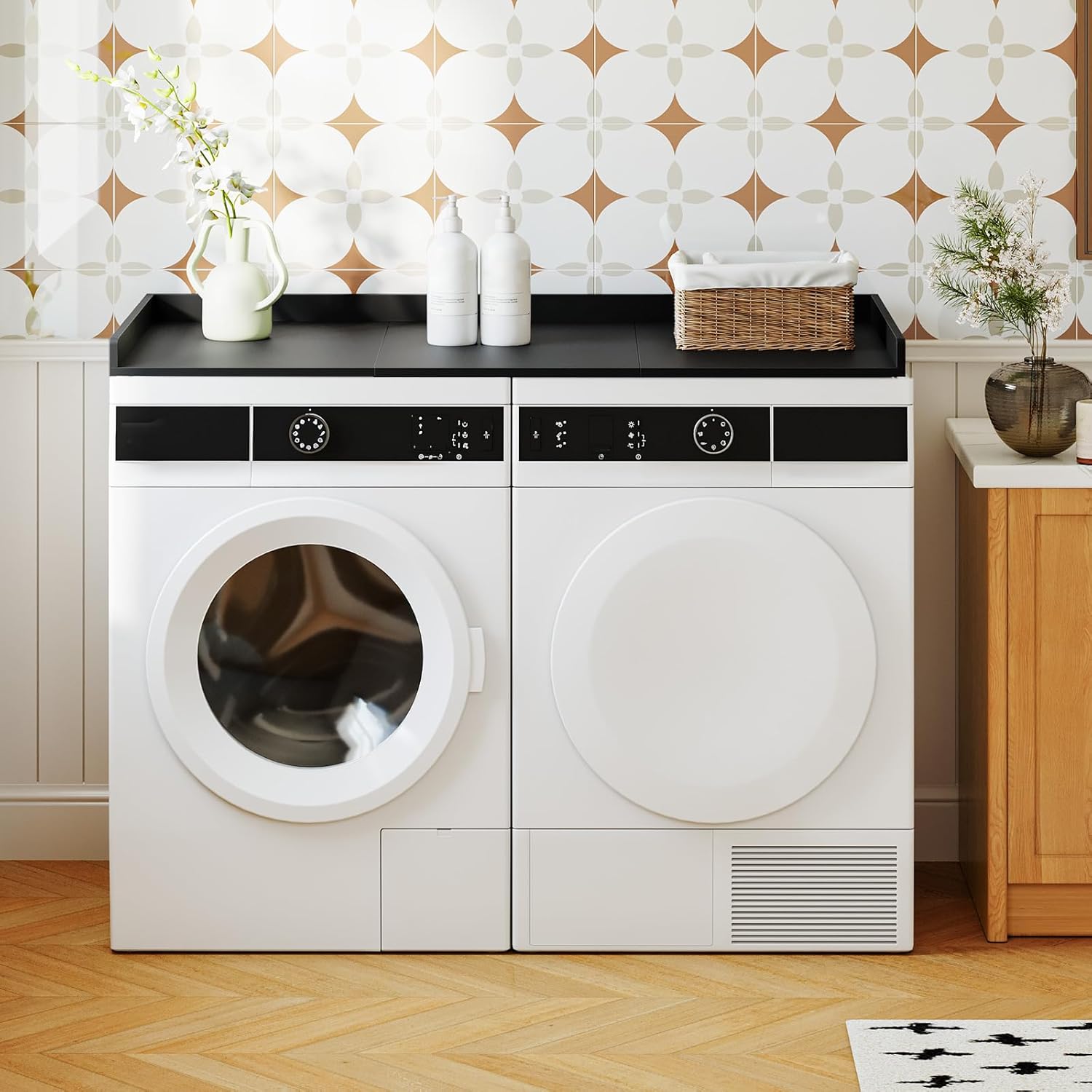 Washer and Dryer Countertop: Place this black laundry countertop on top of your washing machine or dryer to instantly enhance space utilization, keeping sundries organized, creating a tidy laundry room, and making laundry an enjoyable experience