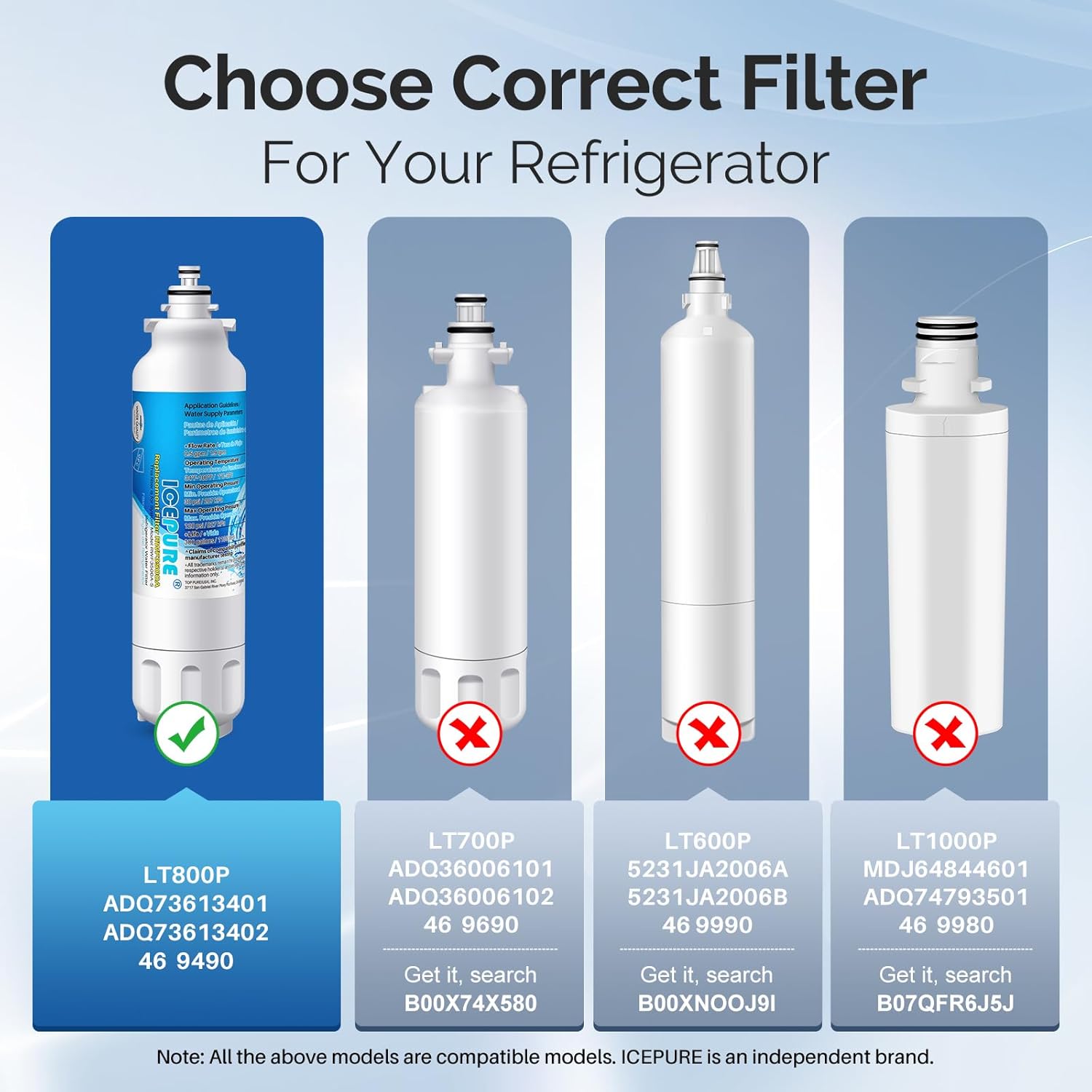 Fit Models-ADQ32617703, ADQ7361340, ADQ73613401/03, ADQ73613401-03, ADQ73613401-5, ADQ73613401-7, ADQ73613401-S, ADQ73613402, ADQ73613402/03, ADQ73613402-S, ADQ73613403, ADQ73613407, LMXC23746, LMXC23746237, LMXC23746D, LMXC23746S, LMXC24746S, LMXS30746S, LMXS30756S, LMXS30776, LMXS30776D, LMXS30776D/02, LMXS30776S, LMXS30776S/01, LMXS30776S/02.LG LT120F ADQ73214402, ADQ73214403, ADQ73214404, ADQ73334008 and Kenmore 46-9918, 469918. ICEPURE is an independent brand.