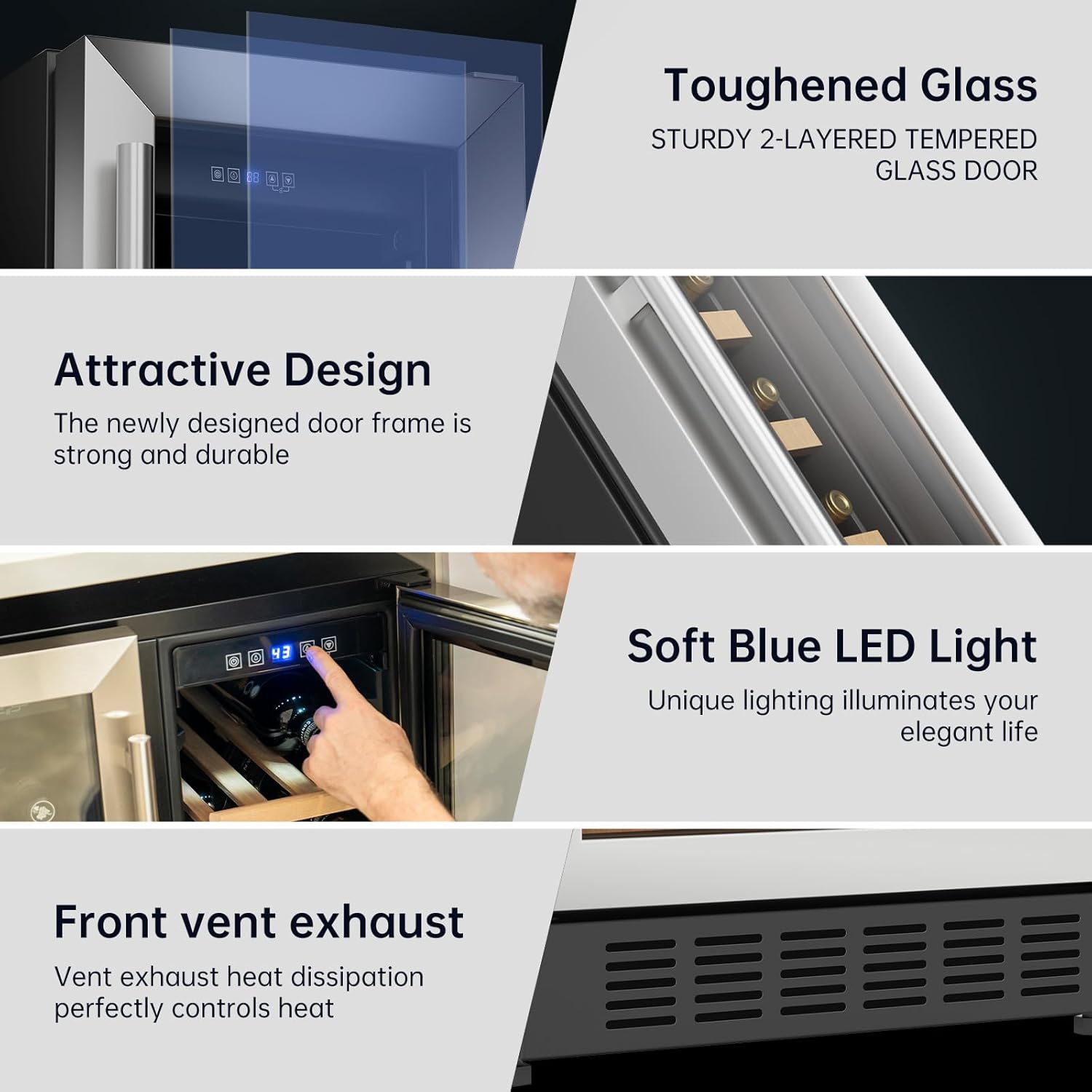 Digital Control Panel: Easily manage your wine collection with our intuitive touch control panel and digital display. You can adjust the temperature, interior LED lighting, and more at your fingertips.