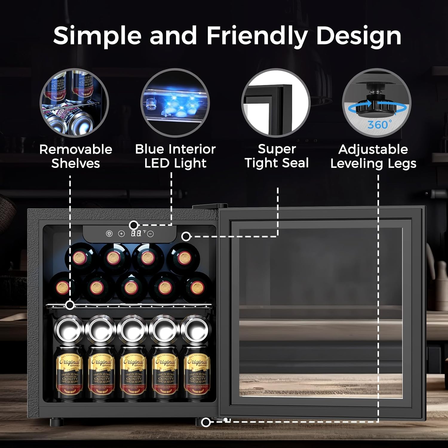 Flexible Placement Options: The beverage cooler features a reversible door and adjustable feet to seamlessly fit into any space. Its compact size (16.46×16.93×18.5 inches) makes it perfect for countertops or minibars