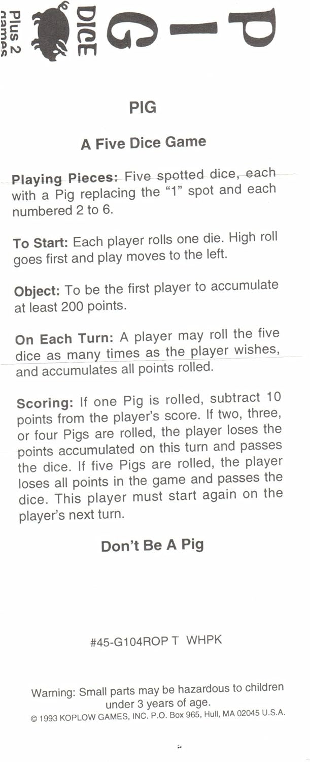Enjoy playing the Pig dice game at home or on the go! All contents of the game are included inside a conveniently sized plastic tube. See gallery images for a copy of game play and rules.