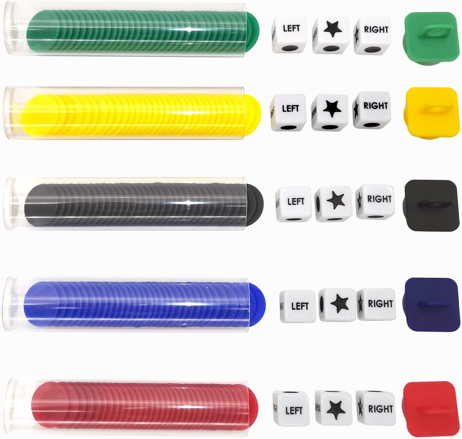 Left Right Center Dice Game Prime Set Bundle with 3 Dices + 30 Chips. Round Tube Storage is Very Convenient for Travel. Easy to Store, Carry Around. (5 Pack)