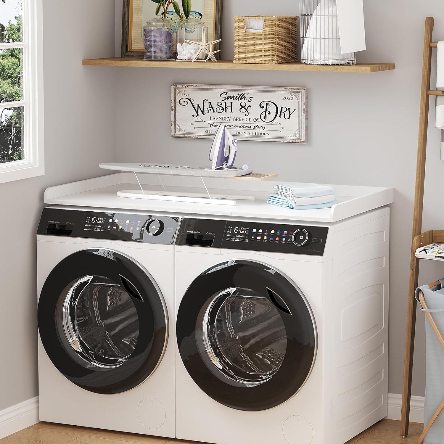 Convenient and Versatile: Maximize the top space of washer and dryer with a spacious work area ideal for sorting, ironing, and folding clothes, as well as organizing laundry detergents and supplies. Supporting up to 200 pounds, it’s built for daily use