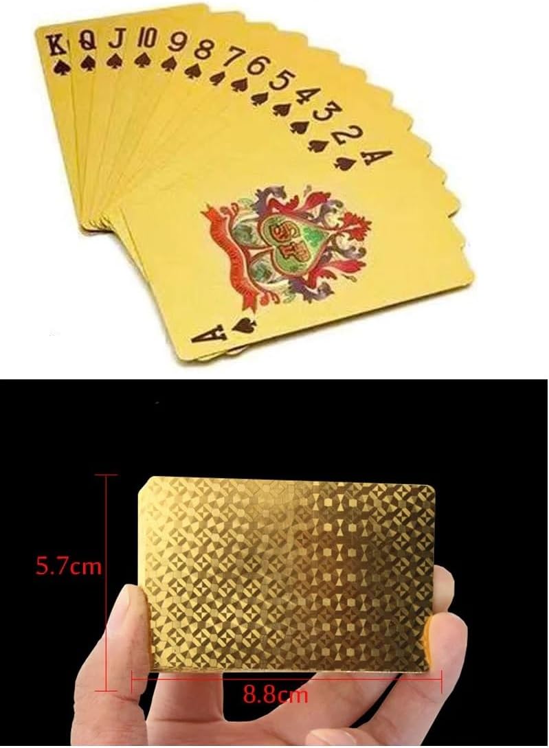 This eye-catching set of 24-karat-gold playing cards will always make you look like a winner during game night.Each of the 54 cards is covered in certified 99.9% 24-karat-gold foil for an opulent look.This set includes 52 standard cards and 2 Joker cards presented in an exquisite case to keep the cards in perfect condition.