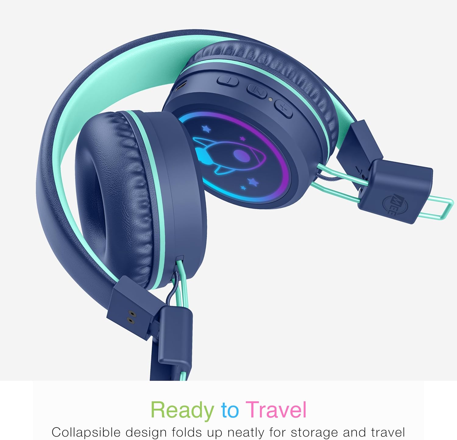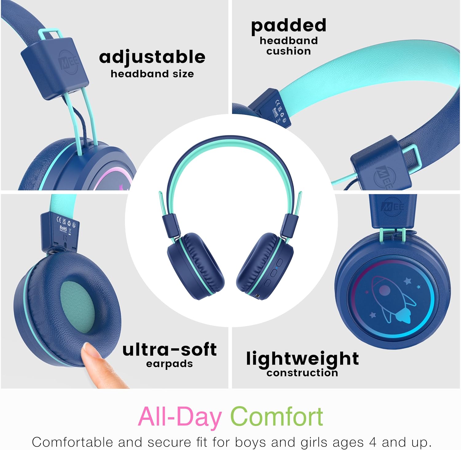 MEE audio KidJamz KJ55BT Bluetooth Wireless Safe Listening Headphones for Children with LED Lights, 85dB Volume Limiter, Mic & 40h Battery (Blue)