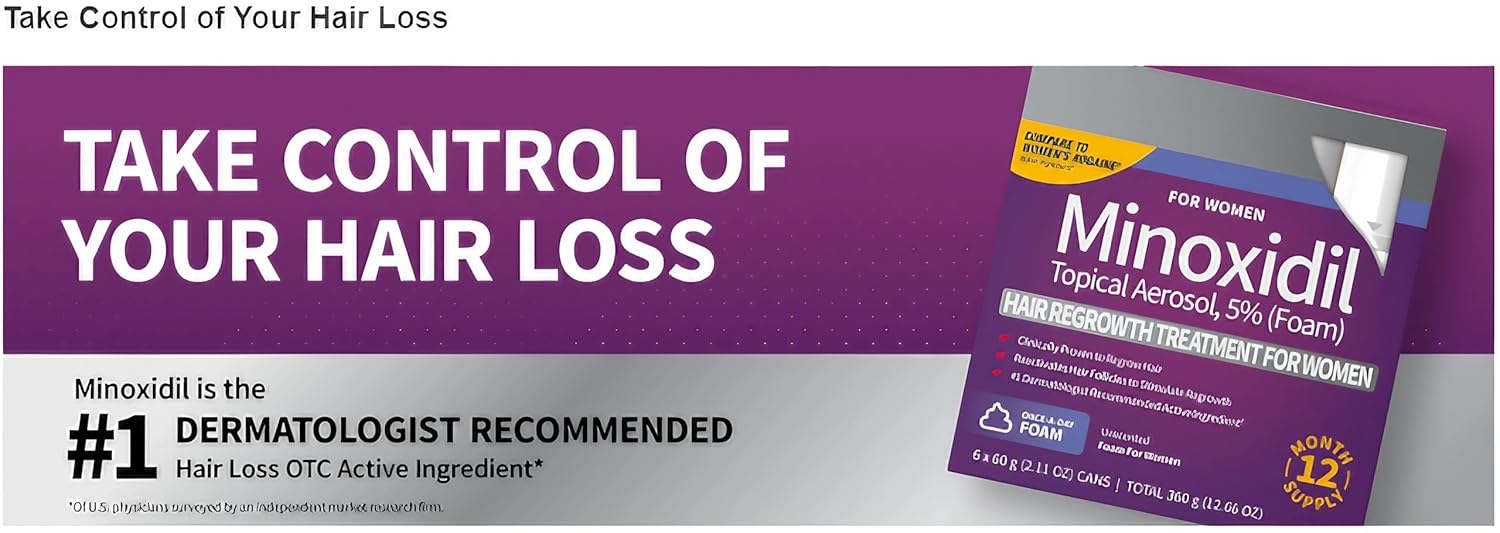 Minoxidil Topical Aerosol, 5% (Foam), Hair Regrowth Treatment For Women, contains the #1 Dermatologist Recommended Hair Loss OTC Active Ingredient (of U.S. Physicians surveyed by an independent market research firm). Clinically proven to regrow hair. When used as directed, this once-a-day minoxidil foam works beneath the surface to reactivate hair follicles to stimulate hair regrowth on top of the scalp. For women who have a general thinning of hair on the top of the scalp. This unscented foam has a child-resistant cap. You may need to use this product for at least 6 months before you see results. WHAT IS MINOXIDIL TOPICAL AEROSOL, 5% (FOR WOMEN)? Minoxidil Topical Aerosol, 5% (For Women) is a white foam containing 5% minoxidil for use only on the scalp to help regrow hair in women. WHO MAY USE MINOXIDIL TOPICAL AEROSOL, 5% (FOR WOMEN)? Minoxidil Topical Aerosol, 5% (For Women) may be appropriate for you if you are an adult who is at least 18 years old and experiencing gradually thinning hair or gradual hair loss on the top of your scalp. The common hereditary thinning or hair loss process begins slowly and may become noticeable only after years of gradual loss. Minoxidil Topical Aerosol, 5% (For Women) is for general thinning of hair on the top of the scalp as shown. Minoxidil Topical Aerosol, 5% (For Women) has been shown to regrow hair in women with the degrees of hair loss shown. If women have more hair loss than shown, Minoxidil Topical Aerosol, 5% (For Women) may not work. Many of those experiencing hair loss have other family members with gradual thinning of hair or hair loss. If there is no family history of gradual thinning or gradual hair loss, or hair loss is patchy, see your doctor. HOW SOON CAN I EXPECT RESULTS FROM USING MINOXIDIL TOPICAL AEROSOL, 5% (FOR WOMEN)? Since normal hair usually grows only 1/2 to 1 inch per month, hair regrowth with Minoxidil Topical Aerosol, 5% (For Women) also takes time. Generally, new hair growth is slow for a Minoxidil Topical Aerosol, 5% (For Women) user. Results may be seen as early as 3 months with once daily use. For some women, it may take at least 6 months for results to be seen. If you do not see any results after 6 months, stop using Minoxidil Topical Aerosol, 5% (For Women) and seek the advice of your doctor. When you first begin to use Minoxidil Topical Aerosol, 5% (For Women), your hair loss may continue for up to 2 weeks. This increase in hair loss is expected and is temporary. However, if it continues after two weeks, see your physician. IF MINOXIDIL TOPICAL AEROSOL, 5% (FOR WOMEN) IS WORKING, WHAT WILL THE HAIR LOOK LIKE? At first, hair growth may be soft, downy, and colorless hairs. After further use, the new hairs should be the same color and thickness as the other hairs on your scalp. HOW LONG DO I NEED TO USE MINOXIDIL TOPICAL AEROSOL, 5% (FOR WOMEN)? If you respond to Minoxidil Topical Aerosol, 5% (For Women), you need to use it once daily to keep and continue the hair regrowth. Up to 3 months of usage may be needed to see your best results from Minoxidil Topical Aerosol, 5% (For Women). WHAT HAPPENS IF I COMPLETELY STOP USING MINOXIDIL TOPICAL AEROSOL, 5% (FOR WOMEN)? WILL I KEEP THE NEW HAIR? Continuous use of Minoxidil Topical Aerosol, 5% (For Women) is needed to maintain hair regrowth. If you stop using Minoxidil Topical Aerosol, 5% (For Women), the normal hair loss process will start again. You will probably lose your newly regrown hair in three to four months.