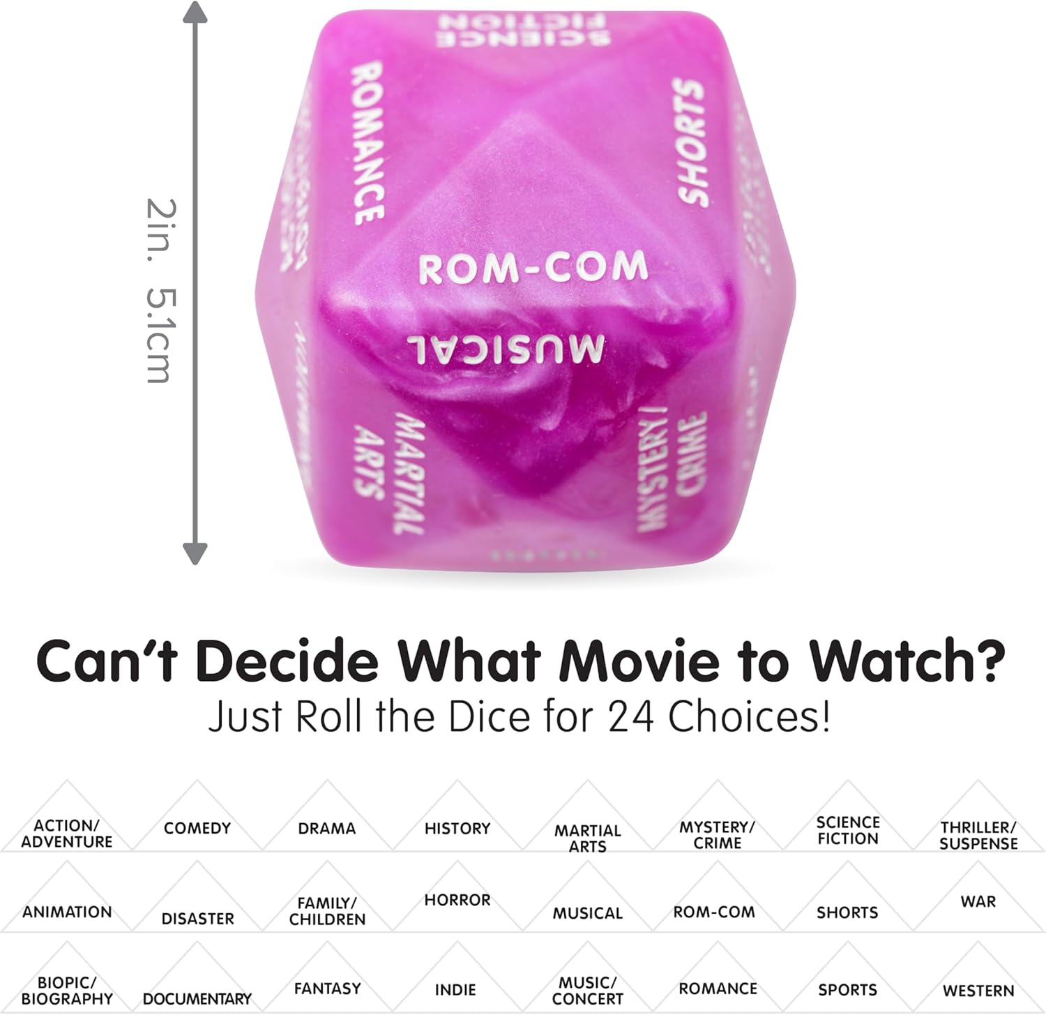 Discover 24 different movie genres with this fun and easy-to-read purple dice with white text