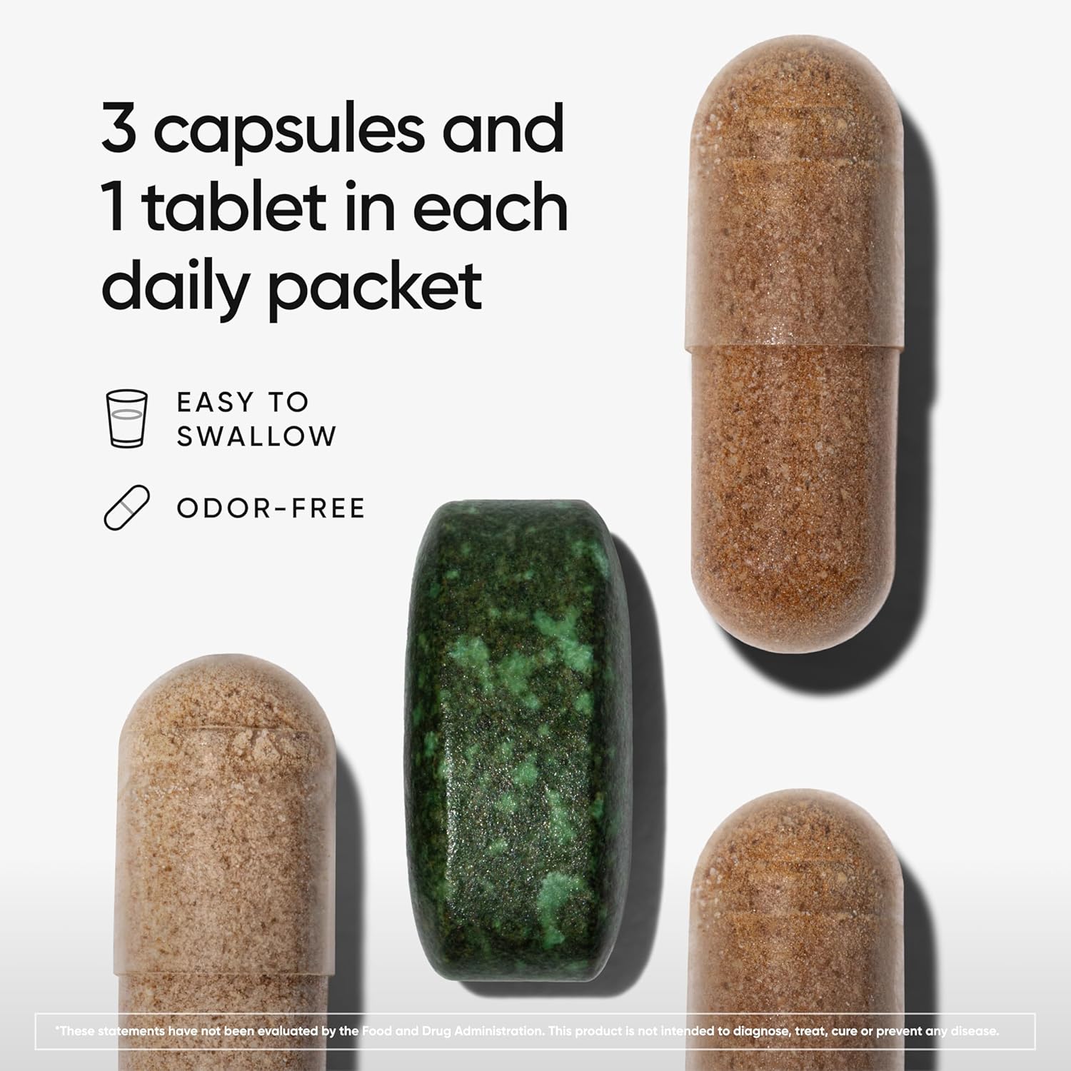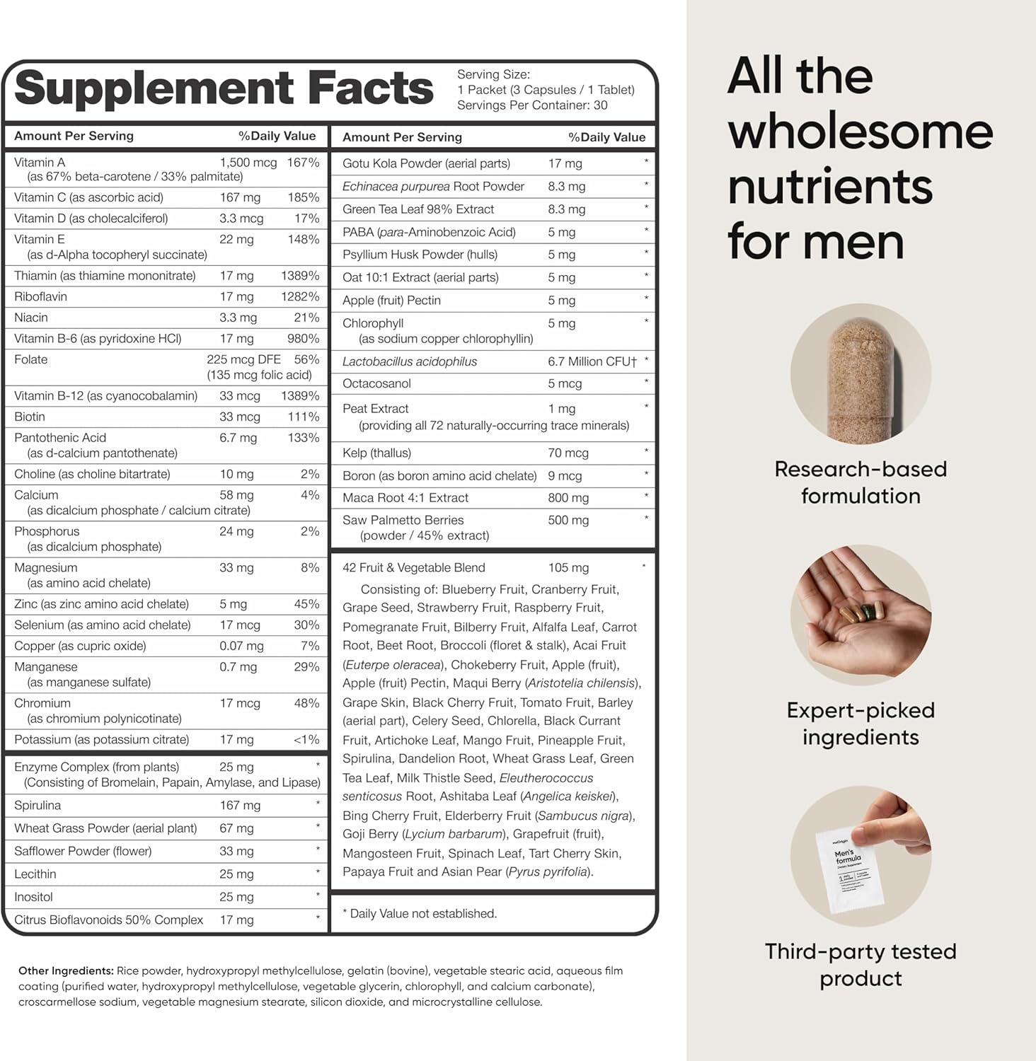 HANDY DAILY VITAMIN PACKS FOR MEN: Just 1 tablet and 3 capsules once a day. Hassle free. No guesswork needed with our men’s daily multivitamin.