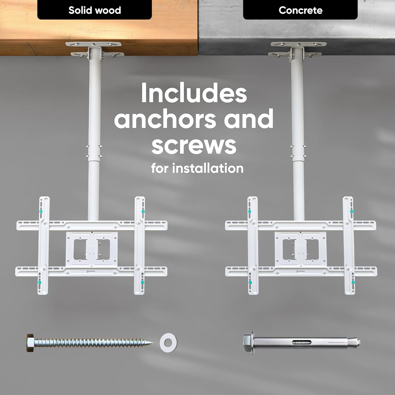 CUSTOMER FIRST | ONKRON pole TV mount ceiling drop down undergoes multi-stage quality control and comes in sturdy packaging | White ceiling TV mount for outside patio has soft inserts to protect the back of the screen from scratches | Our experts are ready to answer any questions you may have about the TV ceiling mounts