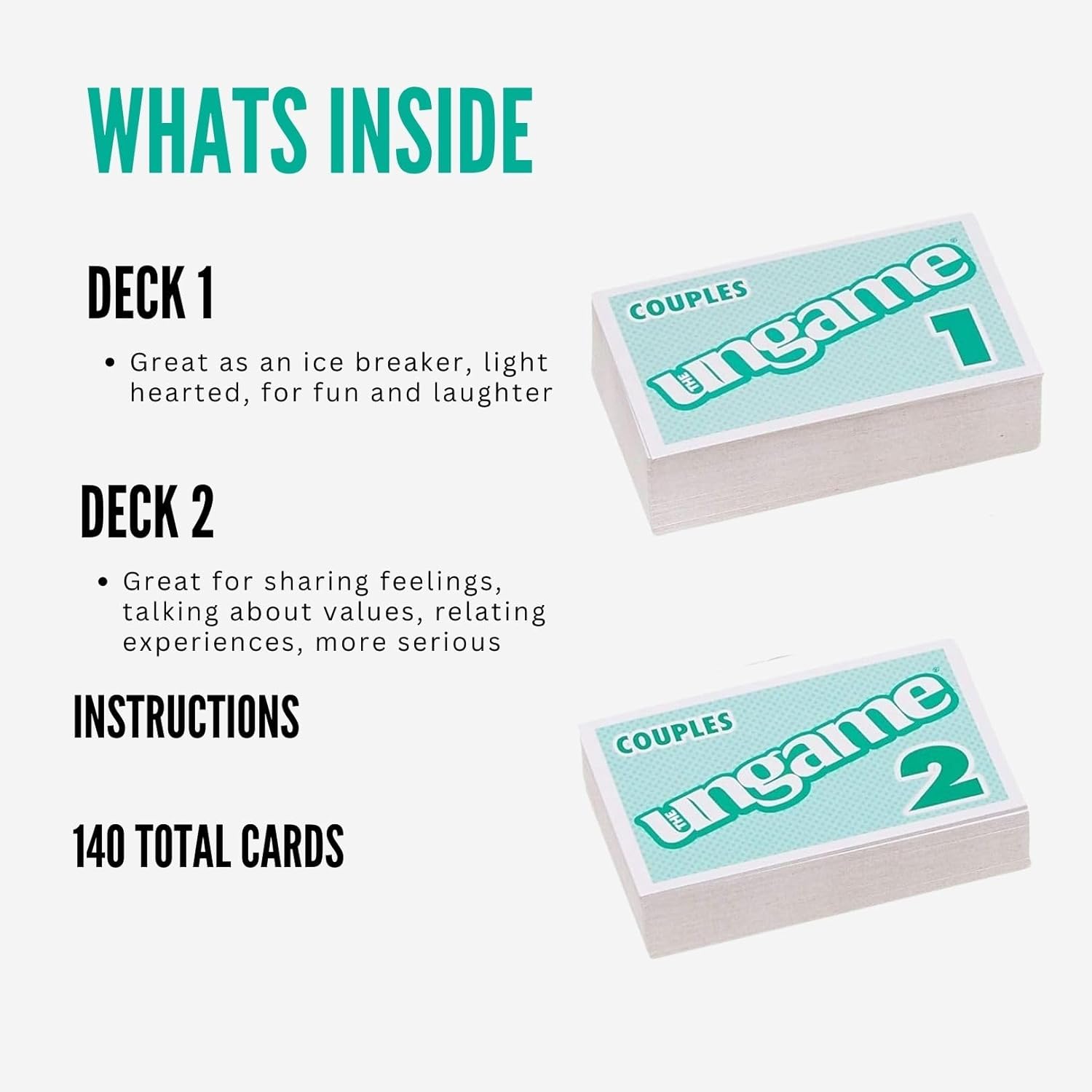Encourages conversation and communication for couples. Great for anyone who is looking for more connection with their significant other!