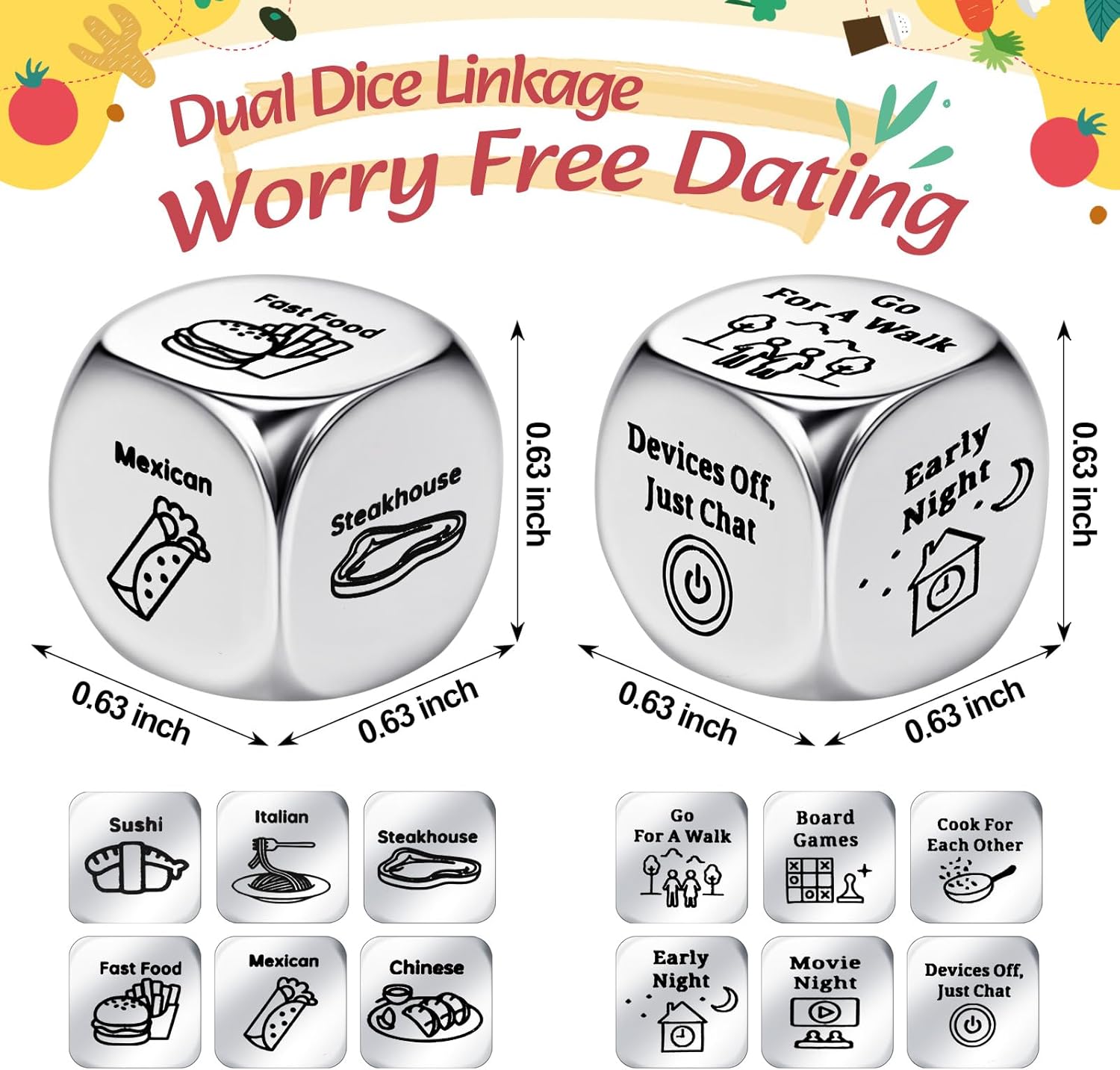 Dual Dice Linkage, Worry Free Dating: the two dice have distinct functions; One decides on the date’s food, covering fast food, Mexican cuisine, steakhouse, etc. It suits various dining scenarios, be it an outdoor picnic or a high-end restaurant meal; The other plans post-meal activities like watching movies, playing board games, or taking a walk; This ensures that dates are always engaging, full of variety, and far from monotonous