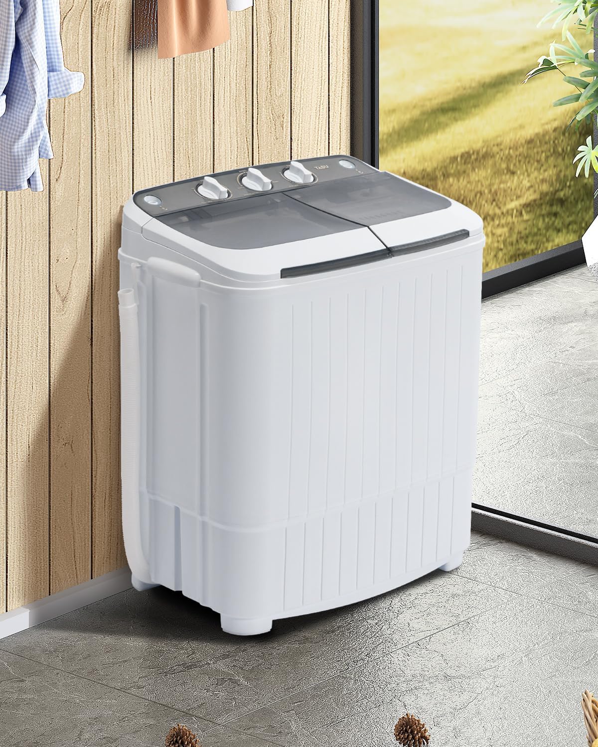 ★ Timer Control & Powerful Performance – Washer control timer runs for up to 15 minutes while the spin cycle timer runs for up to 5 minutes each load. Feel free to choose any time to wash.The portable washer machine features a 1300RPM powerful motor with a max frequency of 60Hz, rotary controls for wash timer and a water efficient design. Watch your clothes get clean with a translucent tub container window.