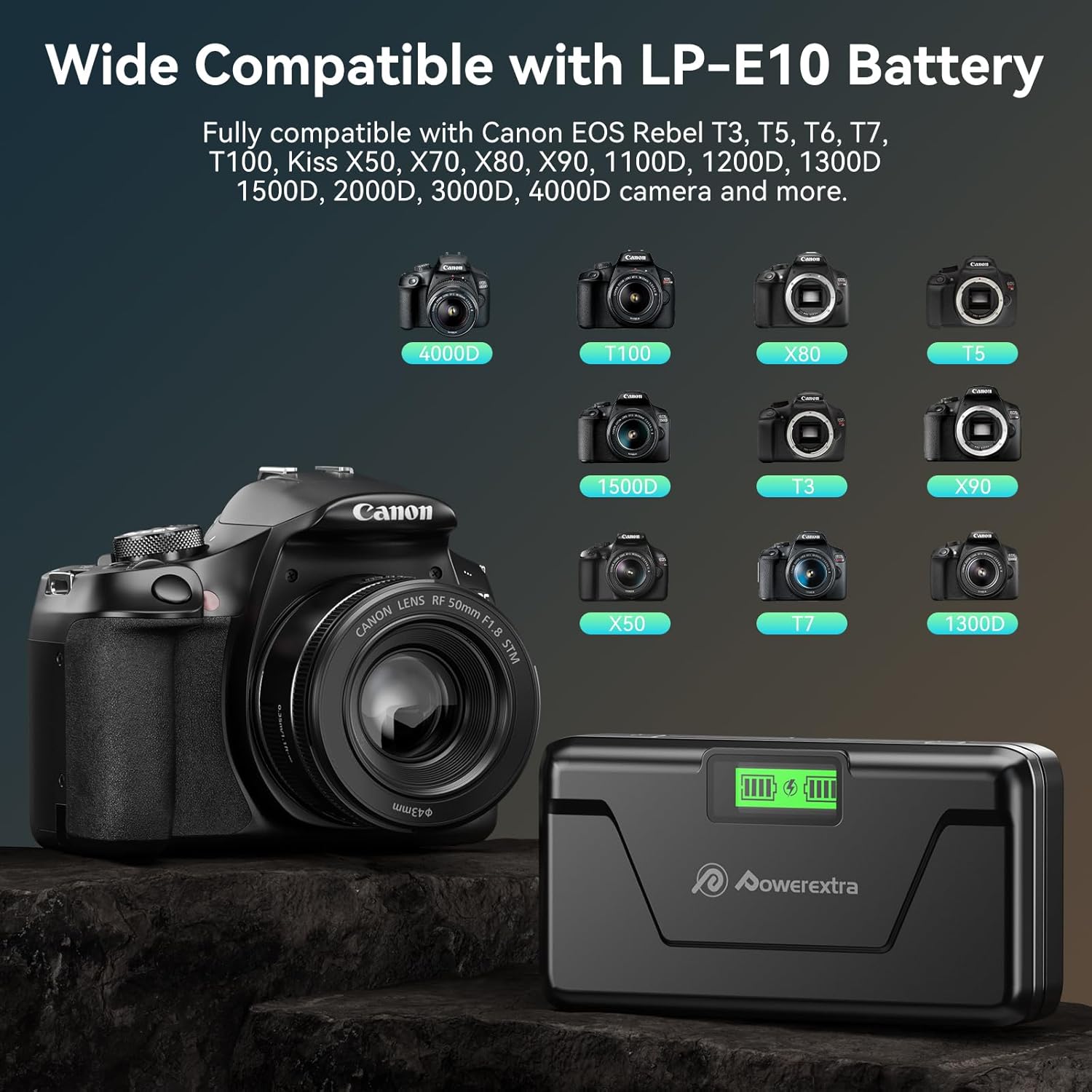 Long-Lasting Power: Dual 1600mAh Batteries! Powerextra LP-E10 batteries offer a combined 3200mAh capacity, providing a reliable and professional replacement for Canon LP-E10 batteries. Enjoy extended battery life for all your video and photography projects, without the worry of memory effect.