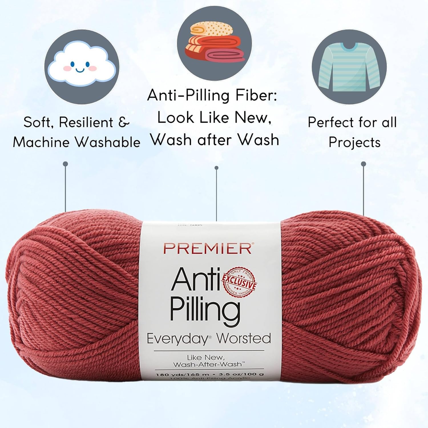 Includes 6 skeins of Premier Yarns Everyday Anti-Pilling – Rosewood DN100-92 yarn for knitting and crocheting. It has anti-pilling acrylic fiber, so your yarn crafts look new wash after wash. It is anti-split and fray-resistant.