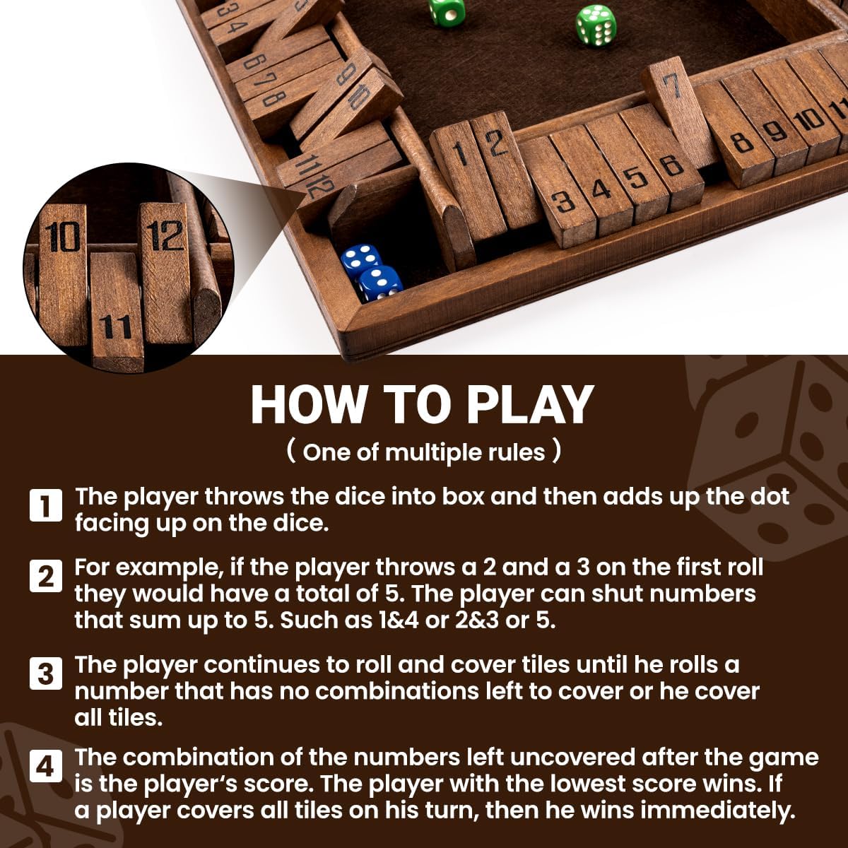 WELL MADE: ROPODA shut the box game wooden is made of solid pinewood and measuring 12 x 12 x 2 inches. This version has 12 silk-screen number wooden tiles that bring more numerical combinations than the ten number versions