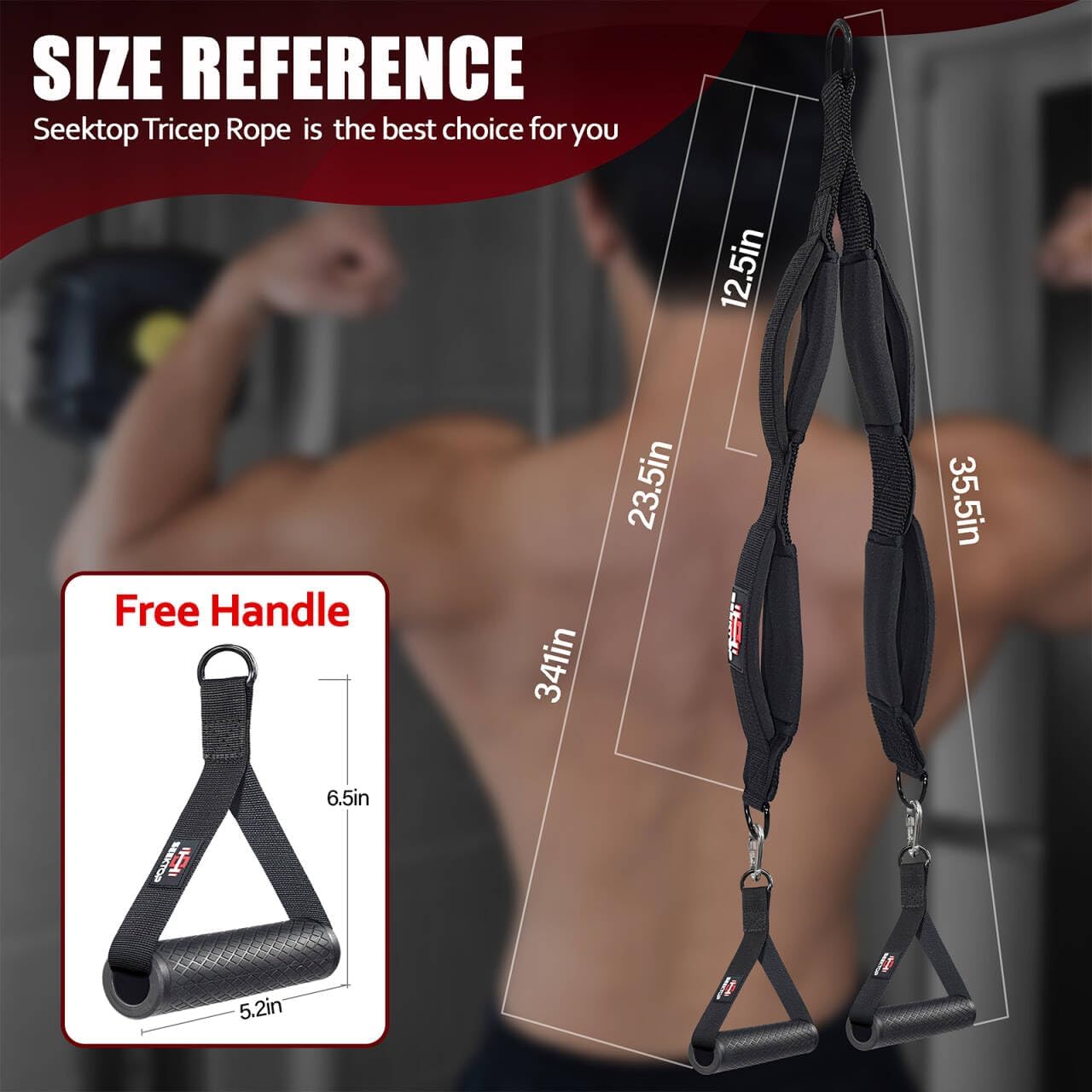 【Multi-Function Design】Seektop tricep rope attachment comes with a separate exercise handle, tricep ropes can be used alone or in conjunction with the exercise handle. Its four-sizes-in-one design provides great versatility to your workout routine by allowing you to easily switch lengths between different rope exercises such as face pull, triceps pushdowns, bicep curls and more cable attachment exercises. Our tricep extension rope is best multi workout cable machine attachment
