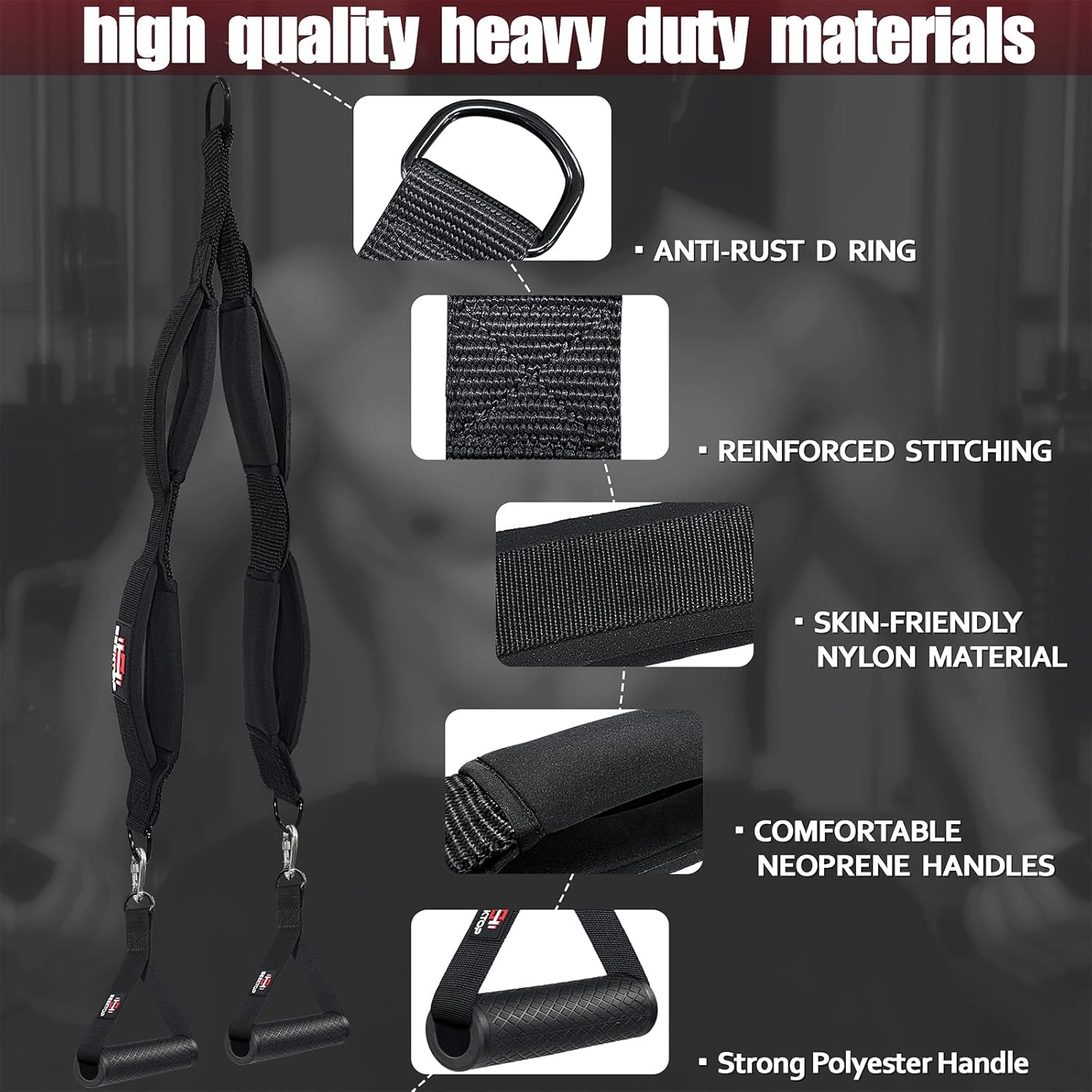 【Better Grip And Comfort】Our tricep pull down ropes is made of neoprene, nylon and polyester materials, which give you with a very firm and comfortable grip. It also features an extra heavy duty D Ring that lets you safely load up all those weights you need for maximum muscular development. The triceps straps provide 4 gripping options allowing placement of hands in the most comfortable position, and the ergonomic design minimizes strain on your wrists