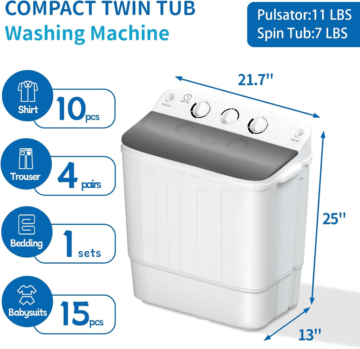 【Twin Tub Design】This compact washing machine features a twin tub design that combines the washing function and spinning function into one. The washing tub has a rated capacity of 11 lbs, while the spinner dryer has a capacity of 7 lbs. Perfect for small loads.