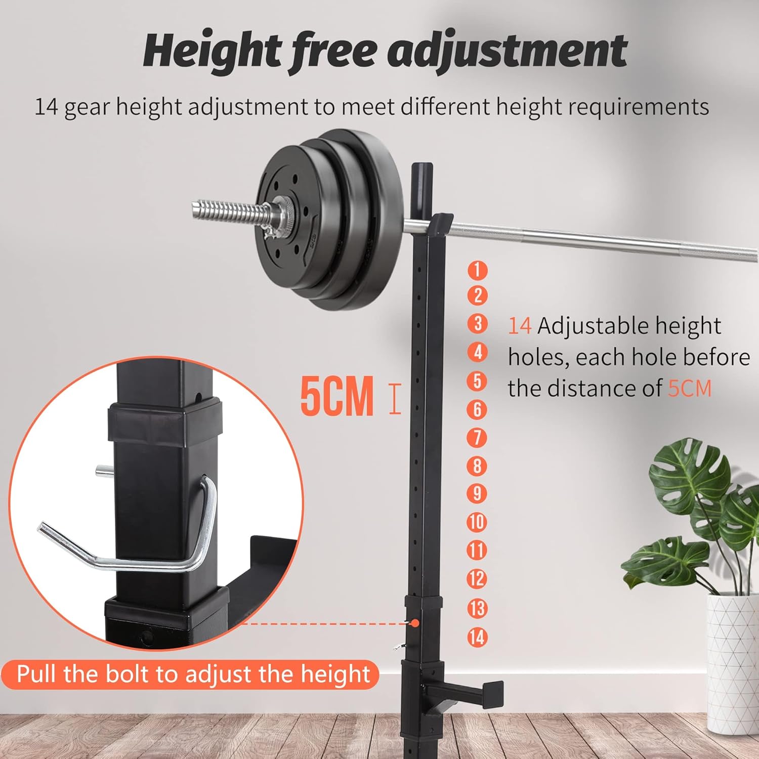 👍【Support 40-60in height adjustment】: By adjusting the different positions of the bolts, the height of the squat rack can be adjusted from 40in to 66in, and you can adjust it to a suitable height according to your height.