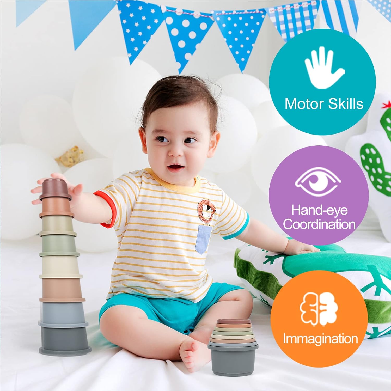 Safe Material: The stacking cups toy is made of non-toxic, BPA-free ABS plastic, which meets American baby toy standards. No bad smell or any sharp edges and corners. The exterior is covered with high-quality feel paint. The smooth surface is safe enough to protect children’s little hands.