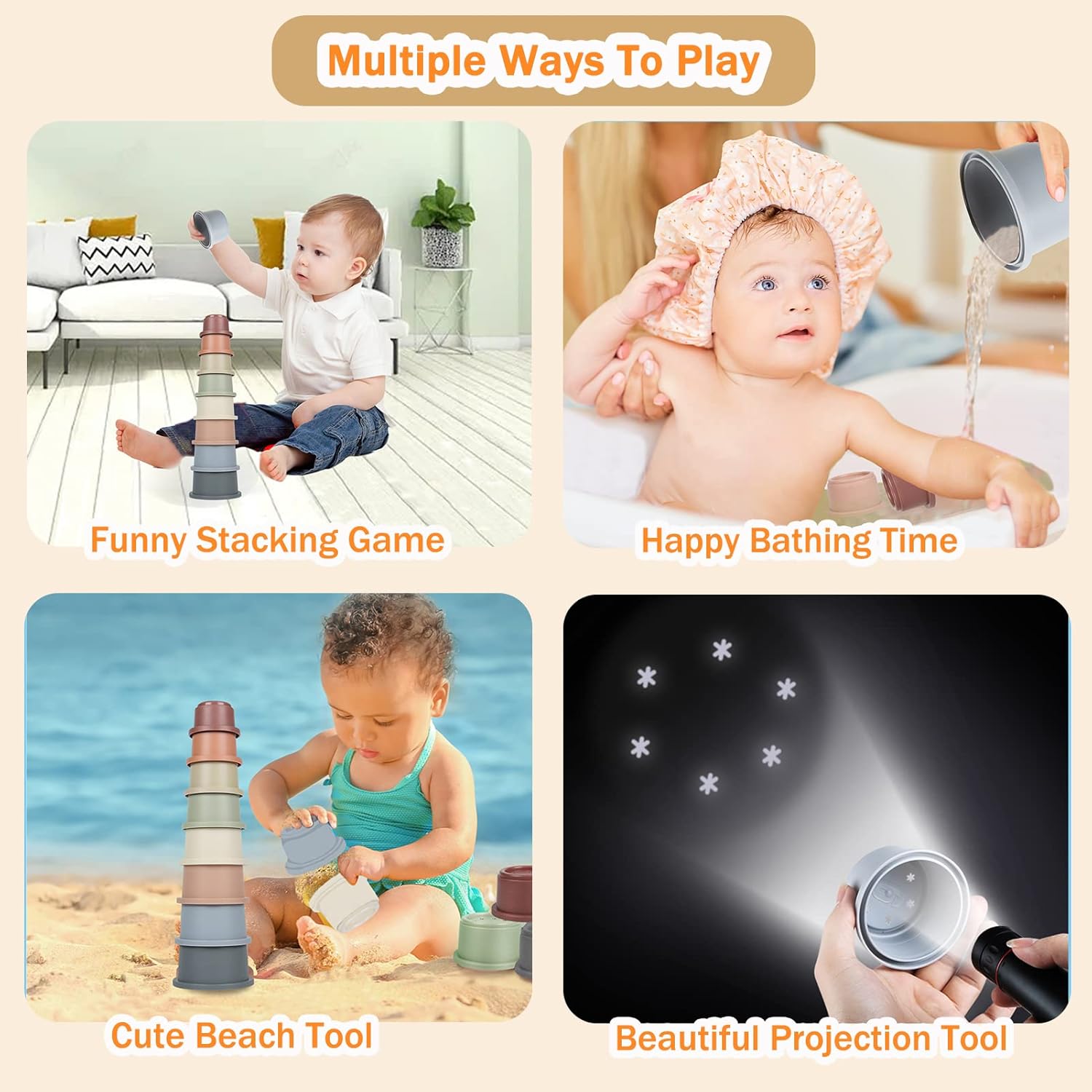 Multiple Ways to Play: Cute Stacked Cup can be used not only for cup stacking but also as bath, beach and projection toys. Due to its hollowed-out design at the bottom, toddlers can even use it to play with water or sand. At the same time, the cup can also be used to feed the rabbits or other pets.
