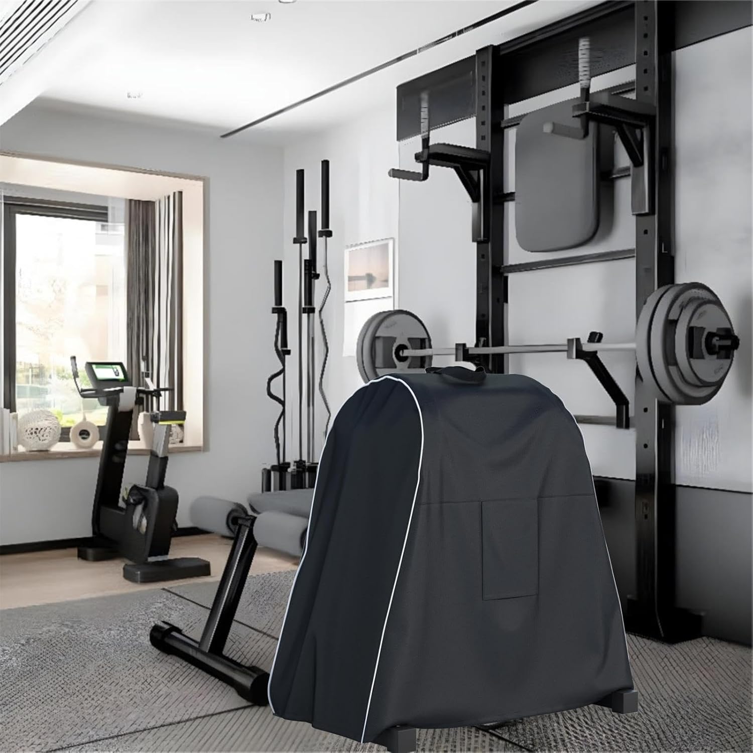 EASY TO PUT ON AND TAKE OFF: Barbell weightlifting rack set has a carrying handle at the top and a drawstring at the bottom that can be loosened, suitable for use on loaded barbell olympic weight block racks. Olympic Weight Rack Dust Cover
