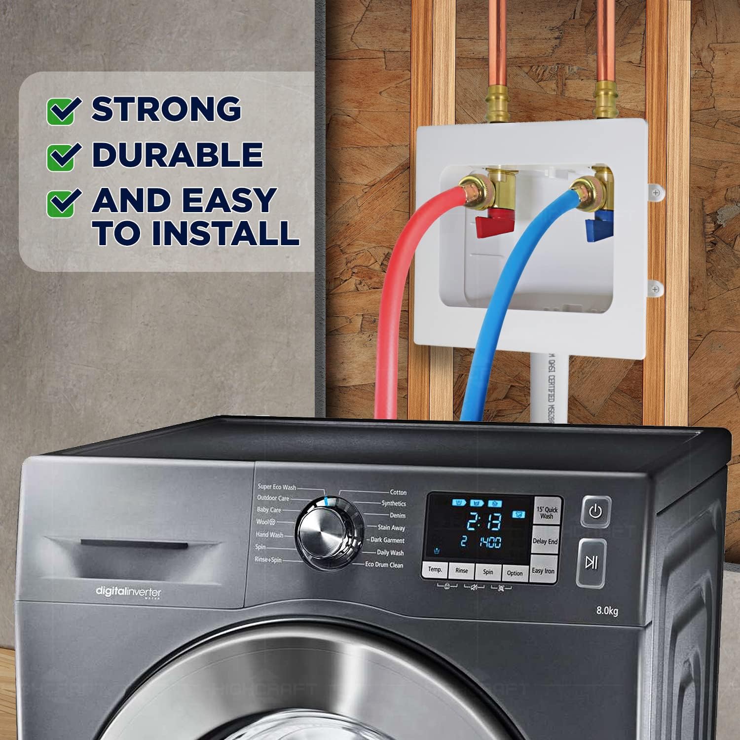 Features Secure, Leak Free 1/2’’ push-fit Connections; 3’’ box depth, Adjustable face plate allows up to 1’’ Wall thickness. Raised Grip guard sEnds Leaks down the Drain. Optional condensation funnel Clips over washing machine discharge Hose.