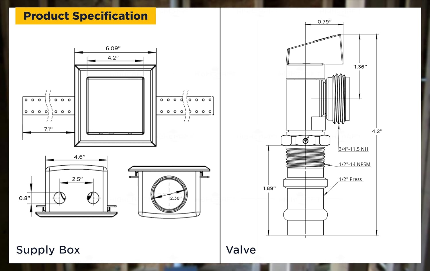 Highcraft washing machine outlet boxes offer you a practical and elegant solution for controlling your water supply. Features secure, leak free connections, with a raised grip guard that sends leaks down the drain. Crafted as one piece out of highly durable ABS plastic. Box can be flipped for top mount valves. Brass body valves with multi turn handle. Max pressure 100 PSI, temperature rating 200 F.