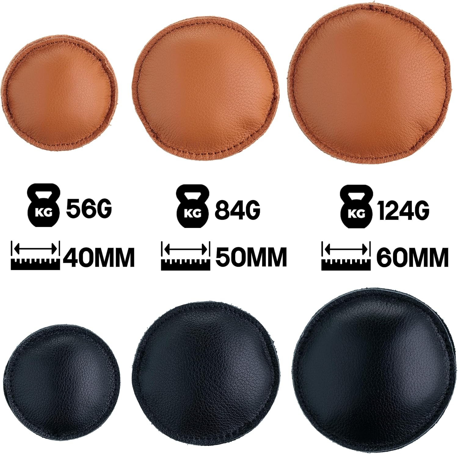 Our leather weights come in three sizes to give you the most flexibility when it comes to sewing. Our smallest weight is 40mm and weighs 56g, the 50mm weight is 84g and the largest weight at 60mm weighs 124g.