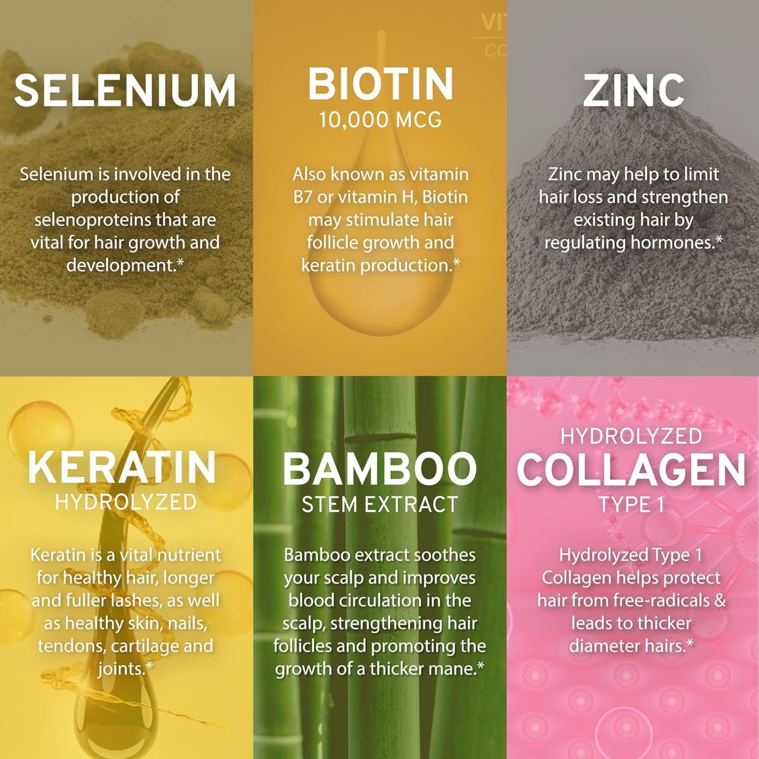 Powerful Collagen Biotin Blend for Hair Growth: Our hair growth vitamins pack a powerful punch with 10,000 mcg of Biotin, along with Collagen, Zinc and Selenium. This combination is designed to help your hair grow longer, stronger, and healthier, including your eyelashes. Biotin strengthens hair follicles.